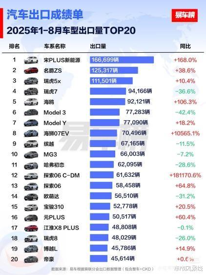 图4:1-8月车型出口排行榜,比亚迪宋Plus新能源独占鳌头
