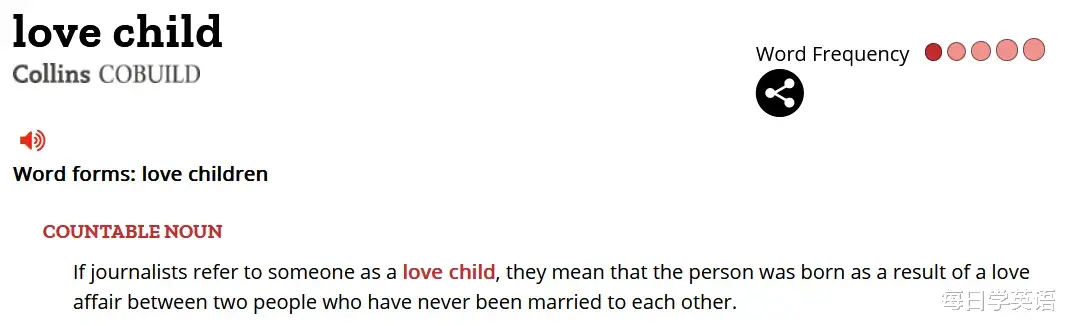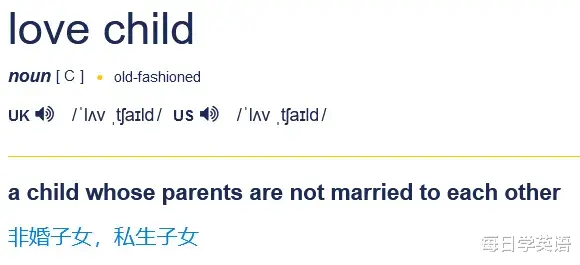 而当直接使用love child这一搭配,中间没有修饰词时,love child则作为一个名词词组使用,它的英语释义是“a child whose parents are not married to each other”。意思表达的就很明显了,love child指的是“父母没有结婚生下的孩子”。