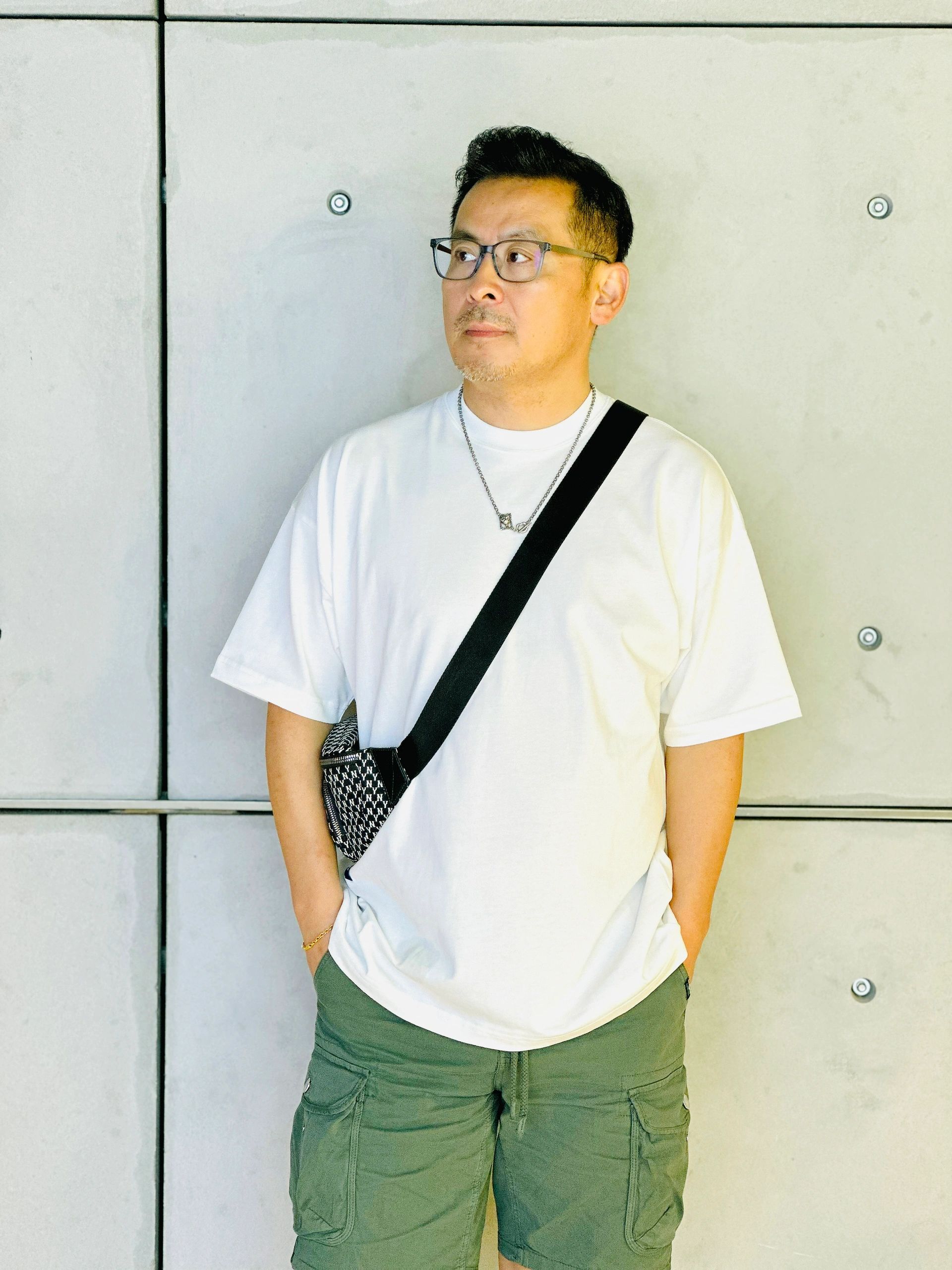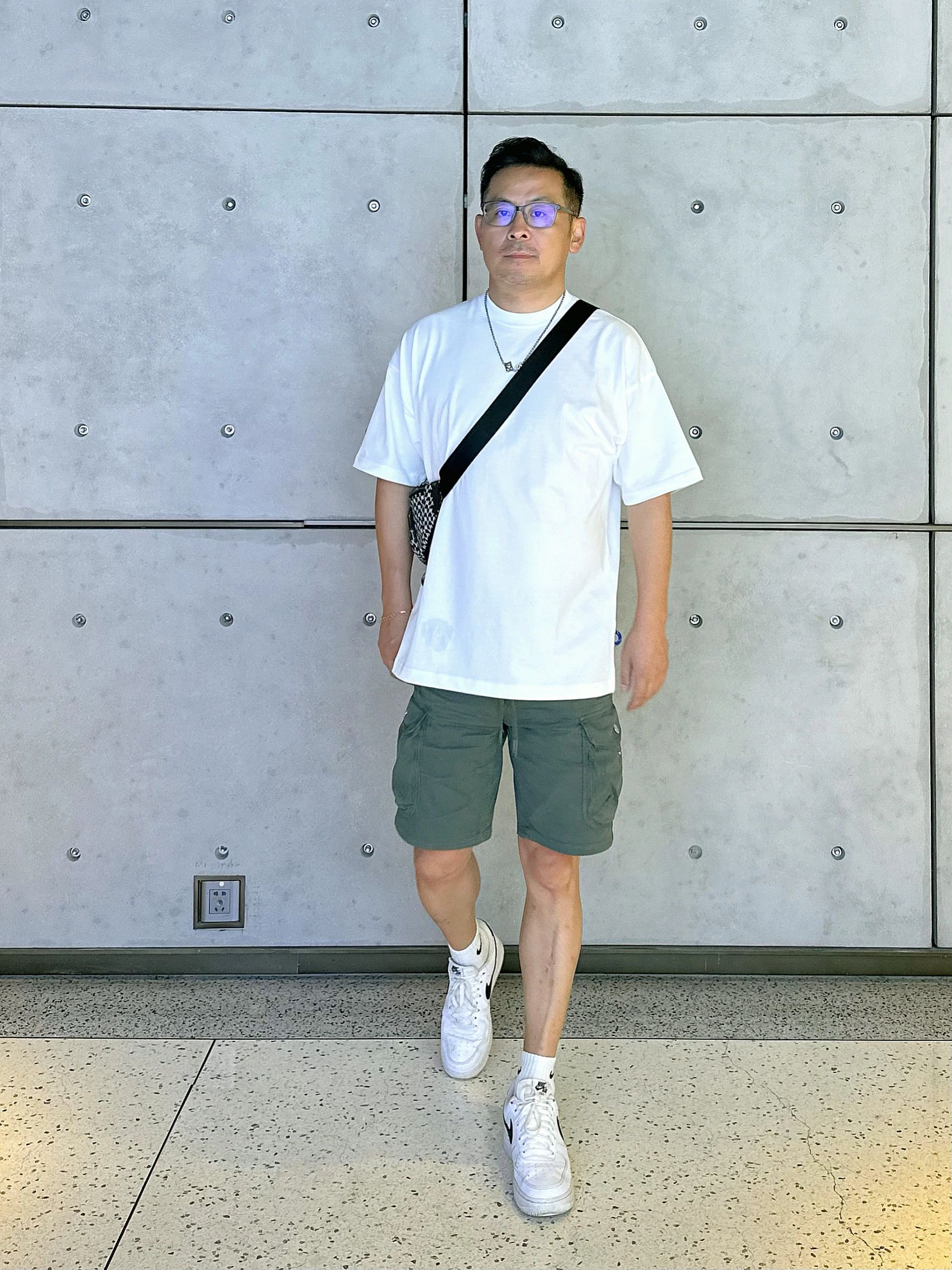 帅气老男人:日常穿搭 骑行服穿搭 种草白色圆领短袖 T恤绿色工装短裤