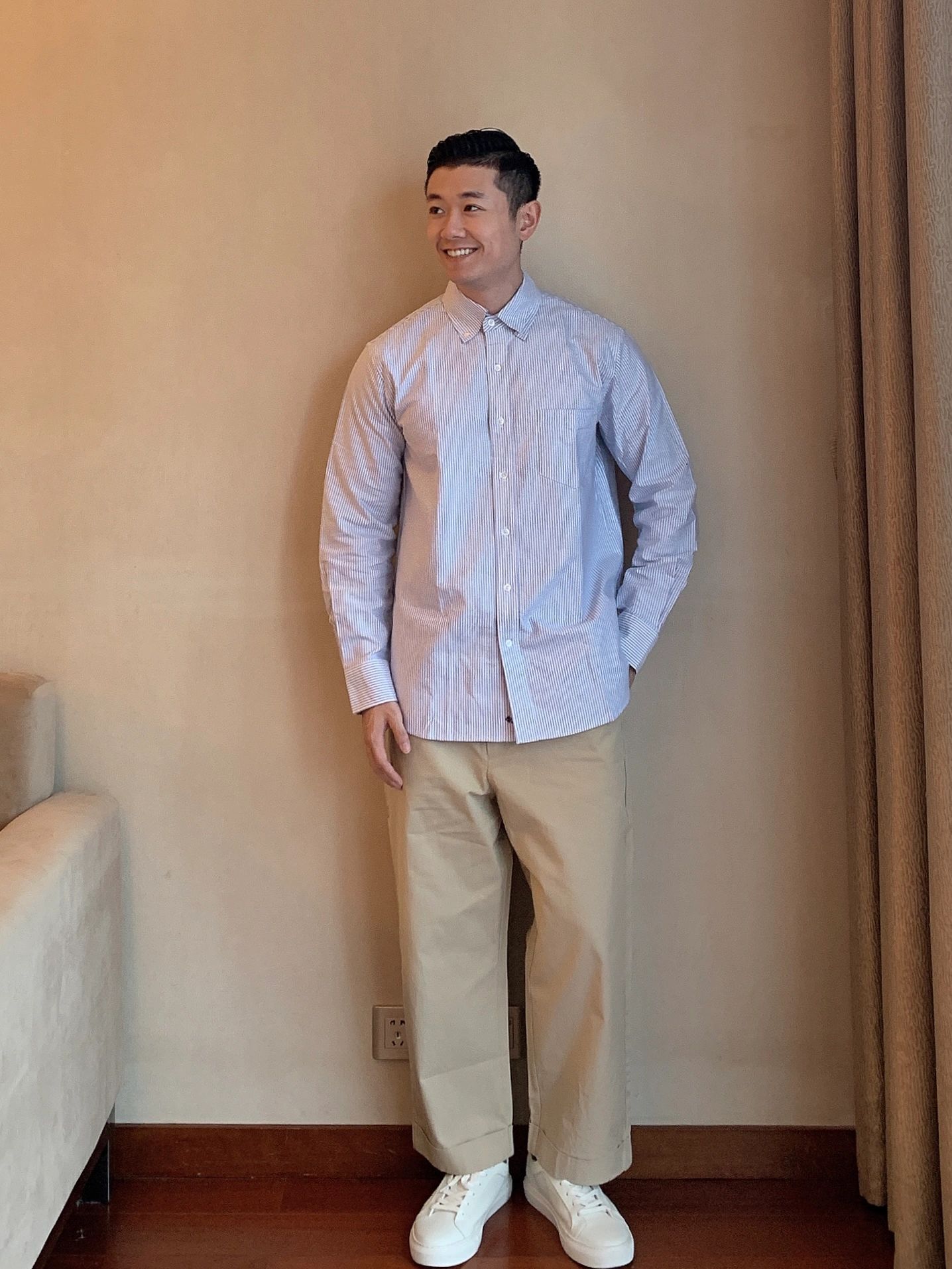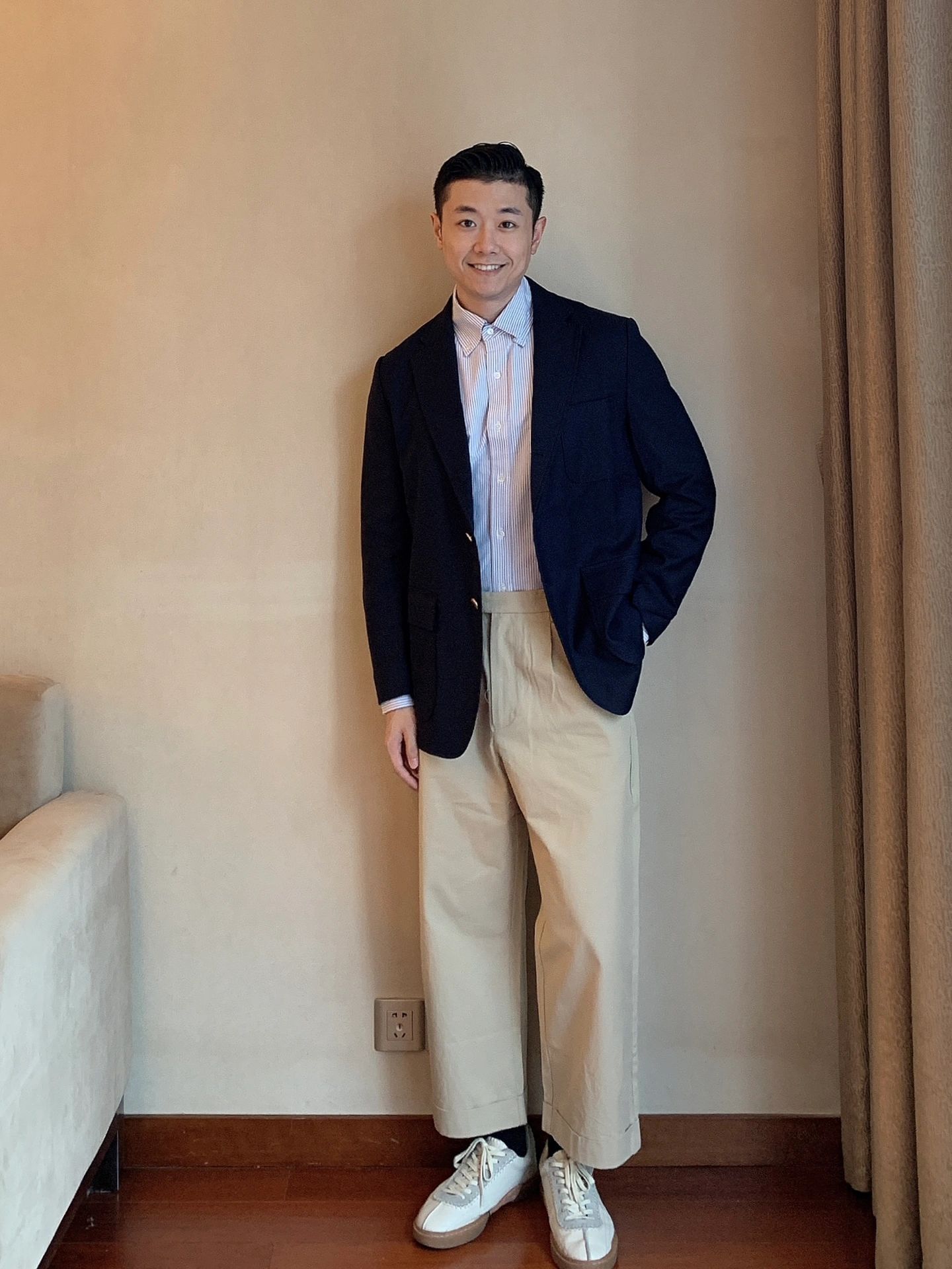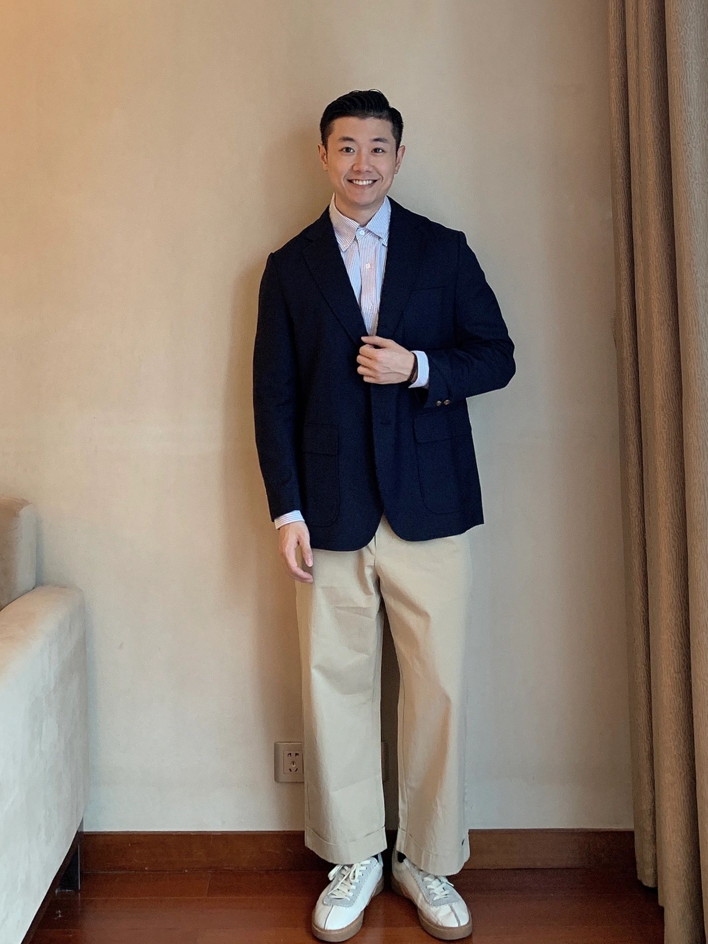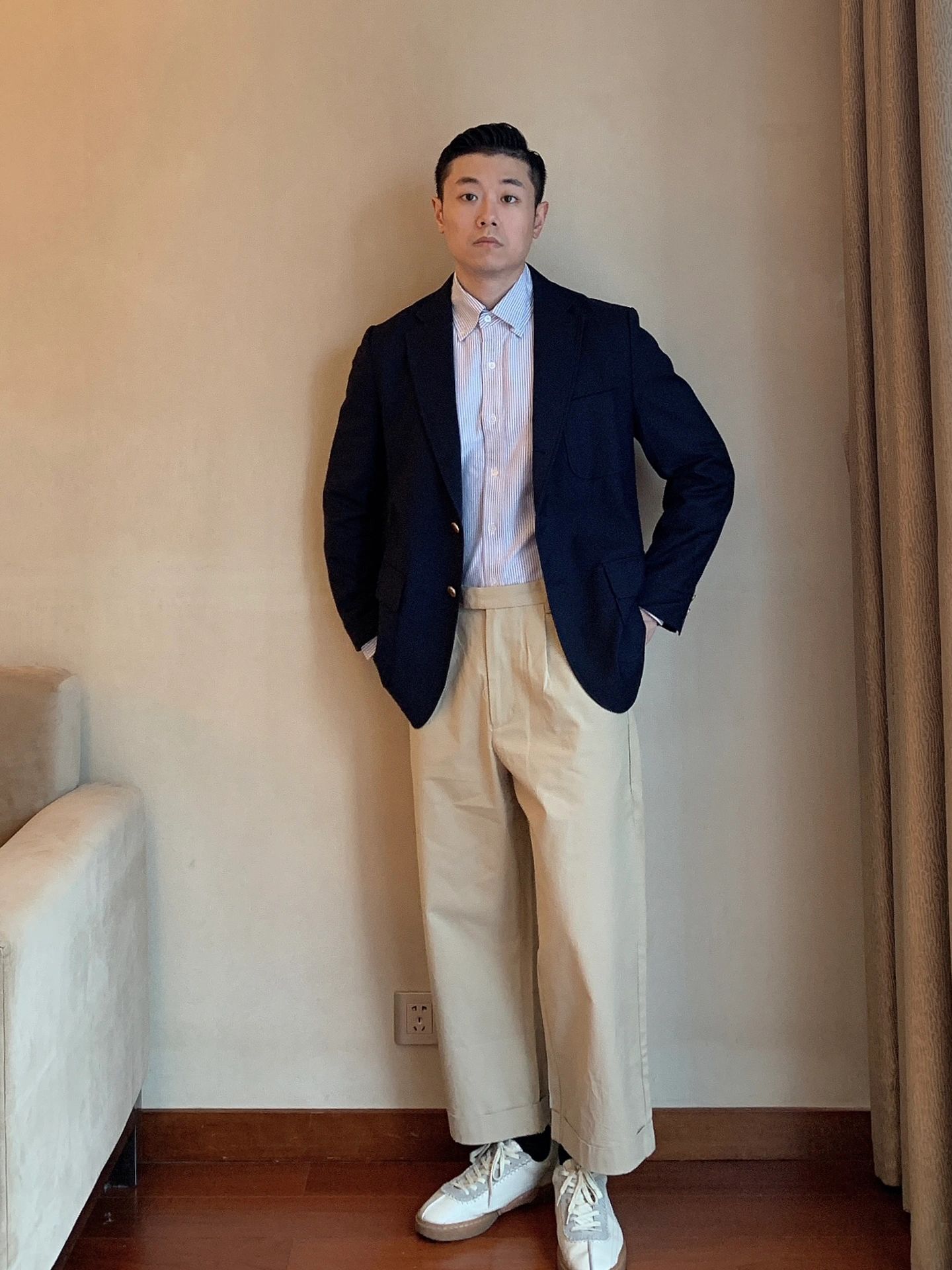 哈喽今天的穿搭分享来啦上身是常春藤单排金扣西装,随便洗水很好打理,海军蓝的配色也非常有味道面料轻薄不闷热,没有刻意设计收腰线,能呈现出恰到好处的宽松感。 三个口袋设计更加休闲随意不拘束。下身搭配一条宽松的9分阔腿裤,面料自带挺阔感。 九分阔腿设计更加符合年轻人的需求裤子后面也有巴黎扣方便调节。
