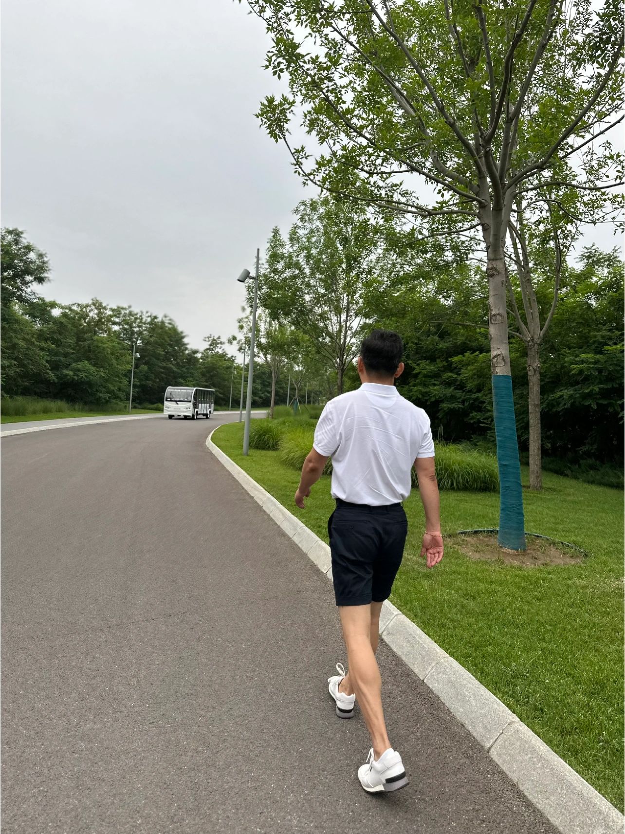 白色polo+蓝色高腰短裤 搭配小白鞋
