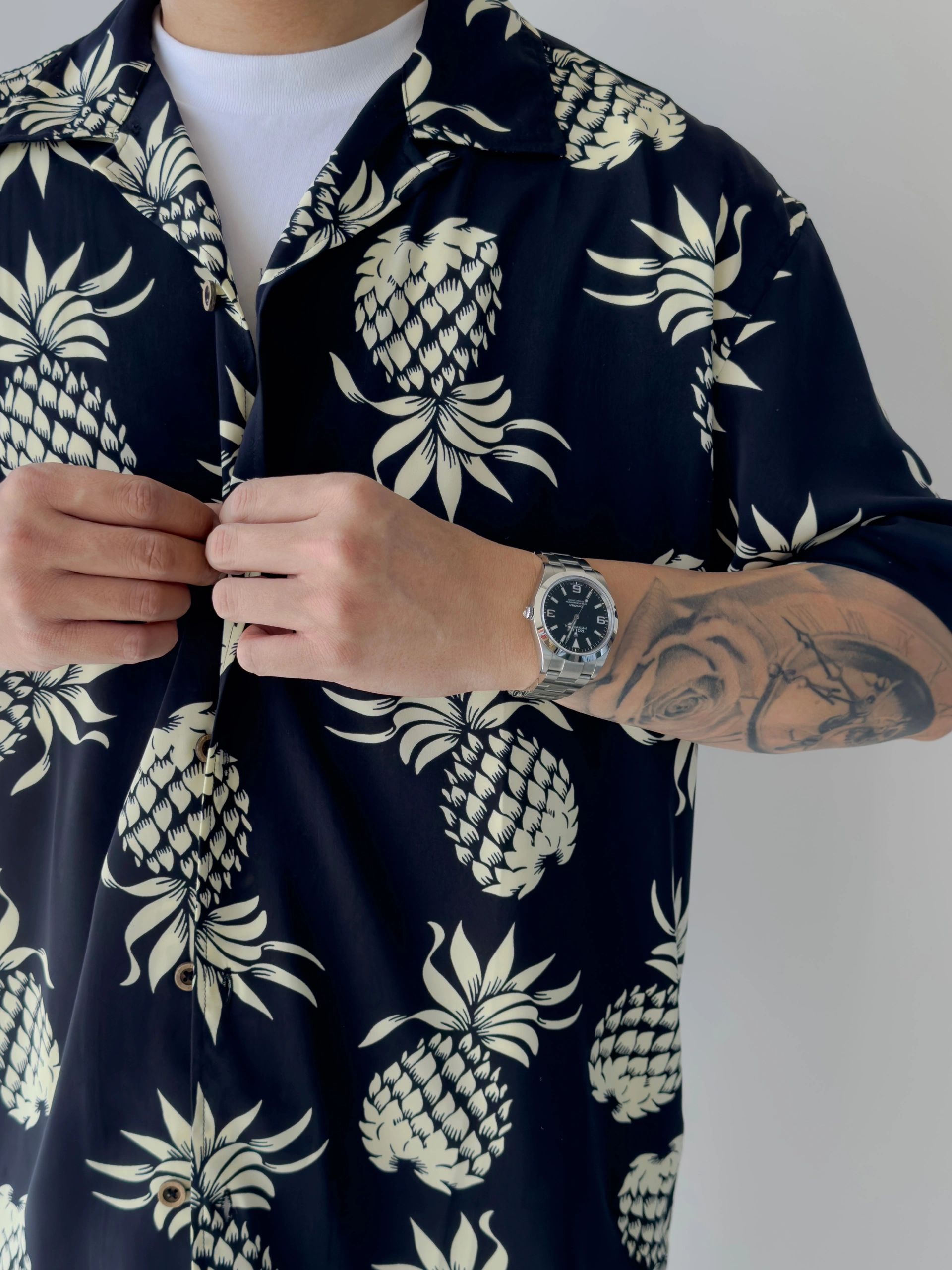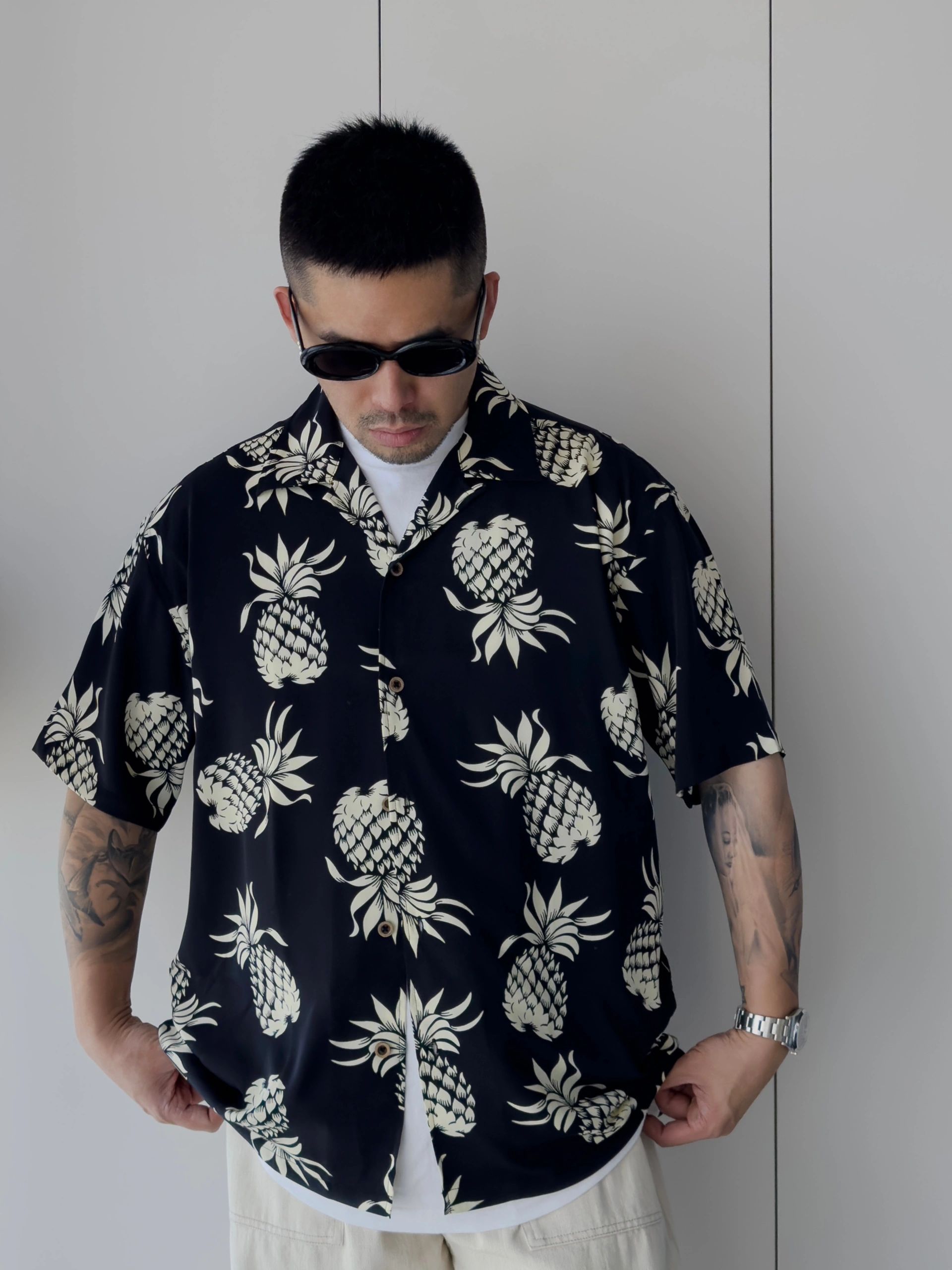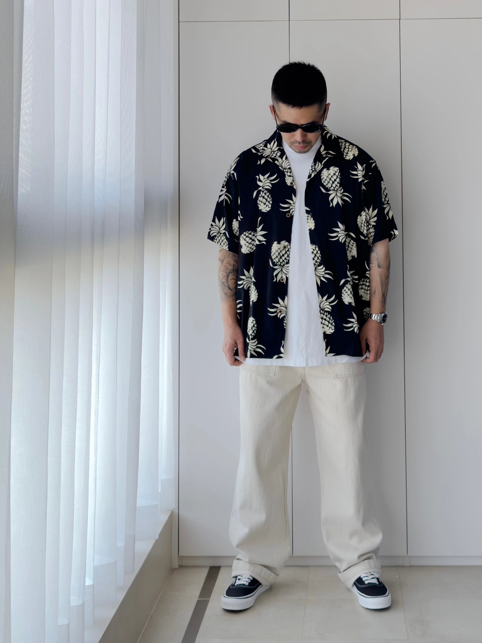 浅尝试一下夏威夷衬衫黑白配色 一定是第一次尝试最好的选择凤梨的图案自带了海岛气息 算得上是自带氛围感