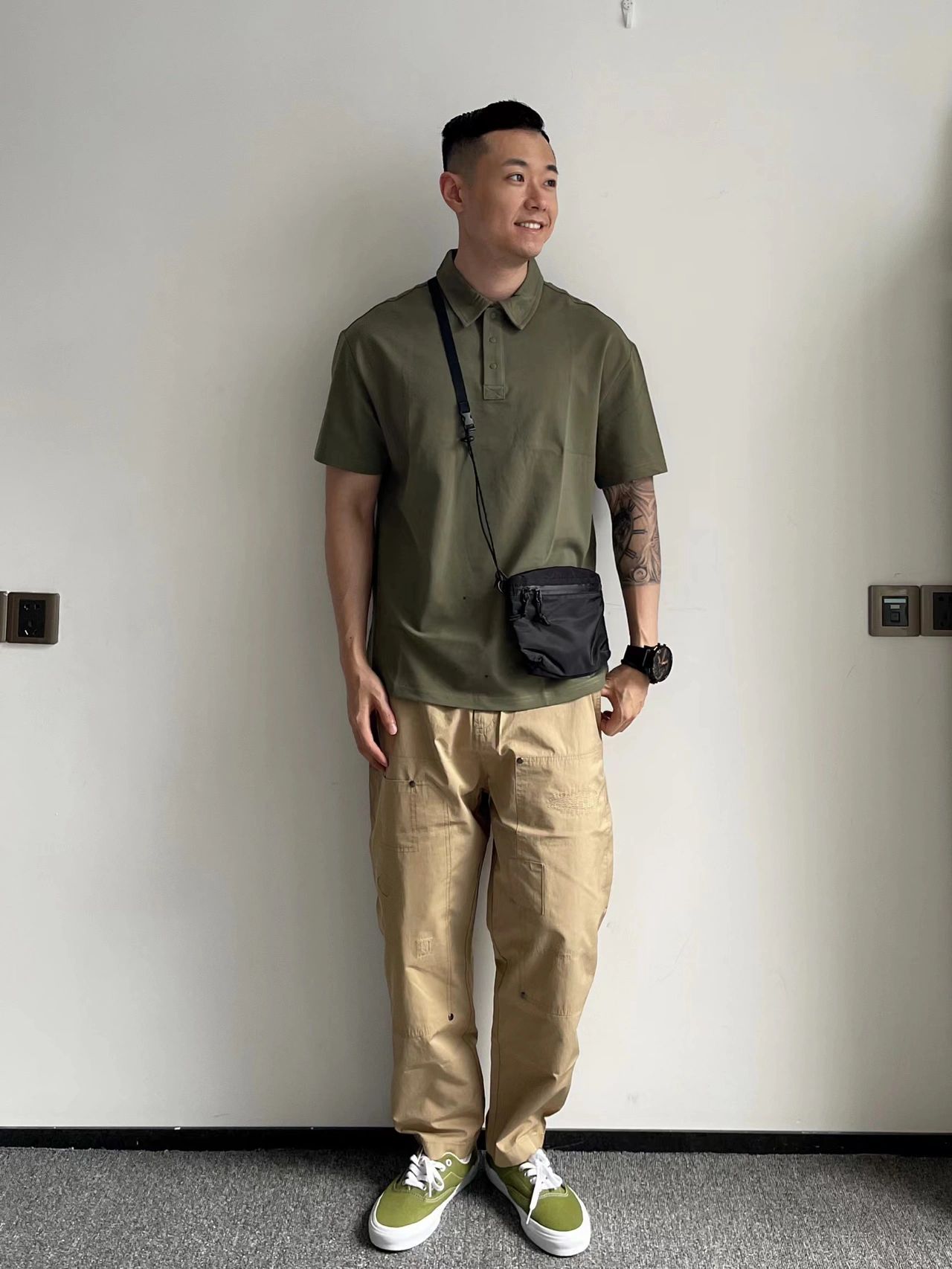 上身军绿色polo比平时选大了一码 休闲又随性自带日系感 对身材包容度很好 无论胖瘦都能穿