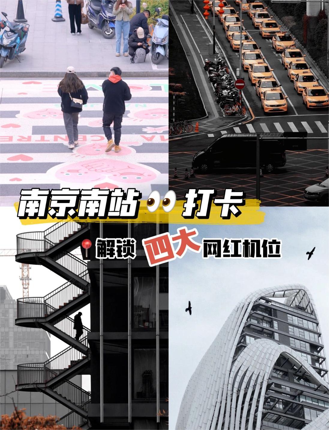 🔸 🌟60min带你打卡南站4大网红机位,来南站别再只拍一条斑马线! 🔸 📸拍摄:EOS R6 ✂️后期:Lightroom / 醒图 🔸 📹「机位1」网红爱心斑马线/红绿灯 🎫:🆓 📍具体定位:HIMA CENTRE; 新晋网红打卡点,️注意交通安全,寻找周边过街天桥,巧用长焦避开人从众; 🔸 📹「机位2」某酒店天台 🎫:🆓 📍具体定位:证大喜马拉雅中心附近; 广角、长焦均可,可以拍摄喜马拉雅中心全貌及南站周边铁路、建筑; 🔸 📹「机位3」证大喜马拉雅中心 🎫:🆓 📍具体定位:证大喜马拉雅中心; 近距离“压缩”建筑群、打卡网红阶梯、俯拍绿色Taxi车流; 🔸 📹「机位4」南京南站南广场 🎫:🆓 📍具体定位:南站南广场3F东侧;(无需过马路,绝对安全) 一侧可以拍摄缓缓驶来的高铁,一侧可以拍摄井然有序的出租车🚕; 🔸 🚃出行: 📍南京南站周边 1公共交通:🌟🌟🌟🌟🌟 🚇地铁1/3/S1/S3号线抵达南京南站后,乘坐电梯前往南广场3F出发平台; 2自驾:🌟🌟🌟🌟🌟 🅿️建议停到南京南站地下车库或周边写字楼停车场后步行打卡; 🔸 ⚠️注意事项: 1部分机位需注意安全,请勿妨碍交通,按爬楼惯例不公开详细定位;(很好找) 2建议线路安排:南广场3F-爱心斑马线-证大喜马拉雅中心-某酒店天台;(速度快的60min就能拍完所有) 3因部分机位视野重叠,拼图可能存在一定误差,但肯定都能拍到; 🔸
