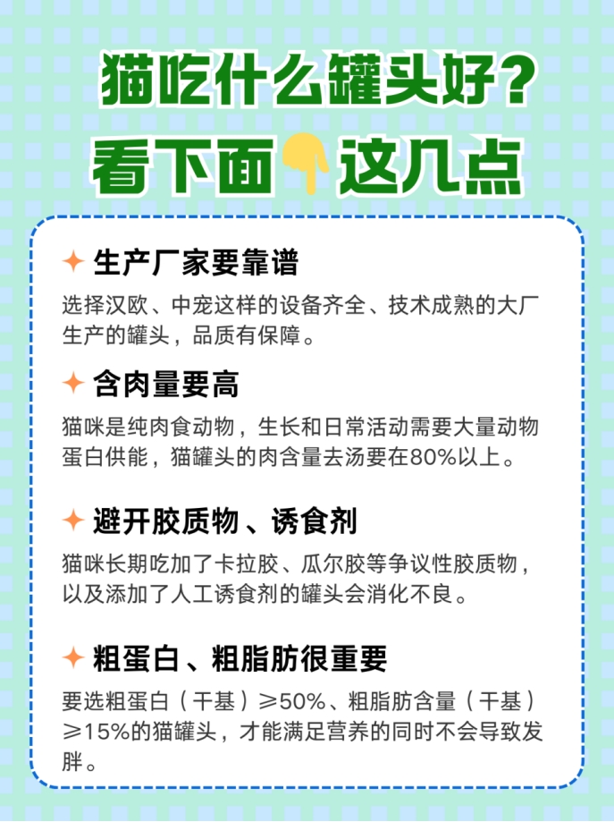 A2:猫罐头可以天天吃吗?猫咪每天吃罐头好吗?猫罐头是可以天天吃的,而且主食罐喂养对猫咪来说也是很好的!猫咪作为纯肉食动物,主食罐的肉含量高、含水量足,既能满足猫咪的饮食天性,又能帮猫咪补充水分,避免尿闭,长期喂下来猫咪的毛发会更有光泽、体质也会更好。但要注意,只有全价主食罐适合天天喂,营养单一的零食罐头只能偶尔喂,吃多了容易挑食。另外要控制好喂食量,根据猫咪的年龄和体重来,避免喂食过多导致虚胖,比如5kg的成年猫,每天喂1-2罐85g规格的罐头基本就够了。
