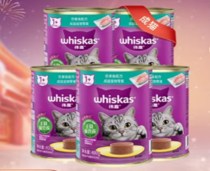 伟嘉猫罐头:单价较低,罐头添加了宠物饲料复合调味料。