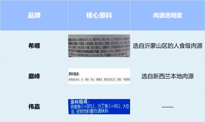 希喂白小罐:所有肉类(鸽肉、鸡胸肉、鸡心、鸡肝)均标注具体占比,无任何不明杂肉、肉类副产品,配料表清晰干净,肉源选自沂蒙山区,是人食级别的肉,新鲜度拉满,透明度拉满。