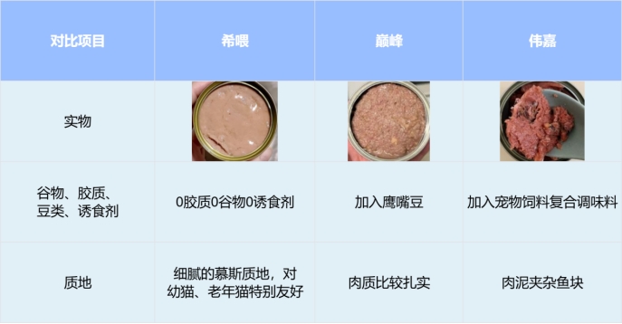 巅峰猫罐头:加入鹰嘴豆,不含胶质物和诱食剂,罐头肉质比较扎实。