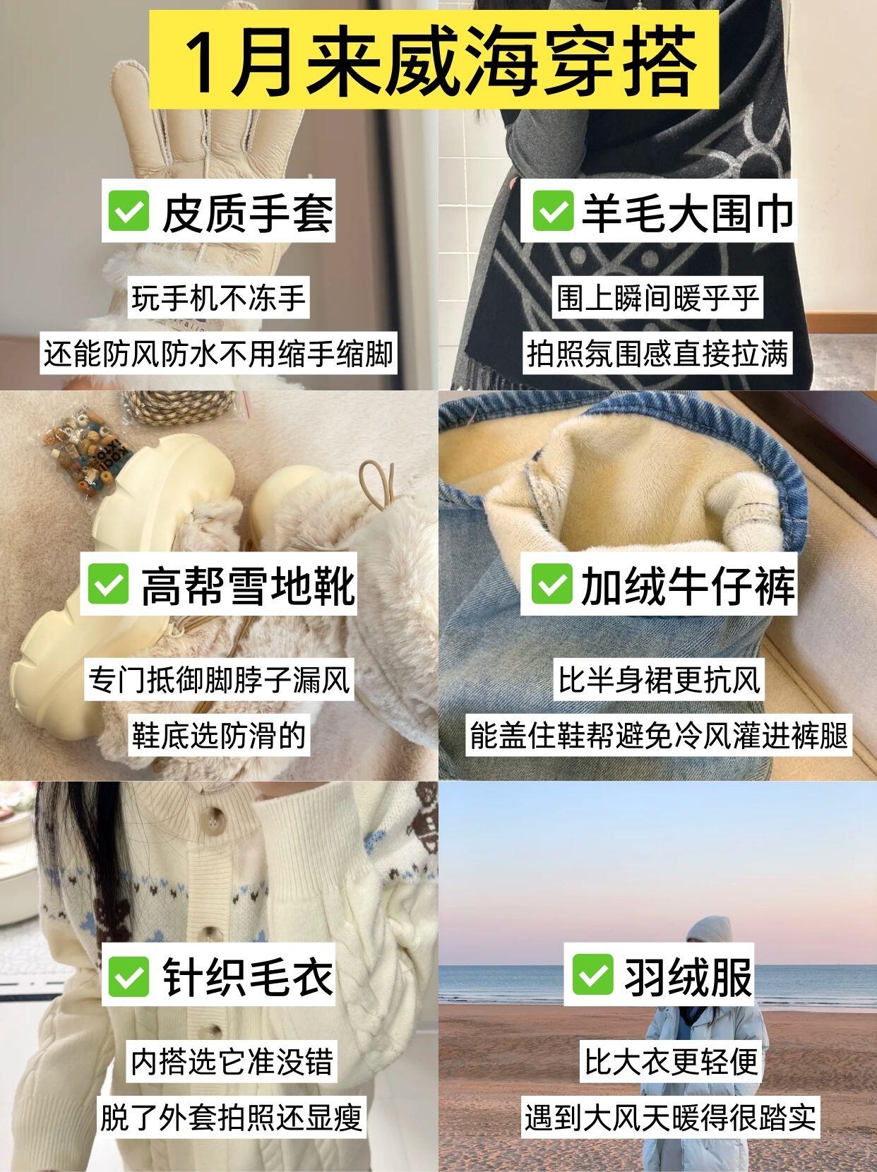 冬天威海寒风超有存在感,穿搭主打防风保暖!建议宝子们穿厚毛衣+羽绒服,怕冷的姐妹可以叠穿加绒打底。帽子、围巾、手套这三件套一定要带,海边的风真的很“冻人”!