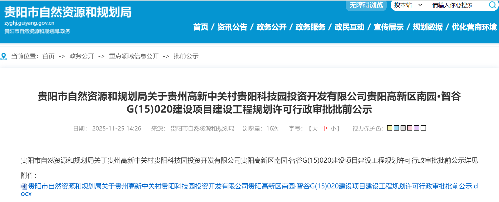 11月26日,据贵阳市自然资源和规划局消息,其发布行政审批批前公示,对“贵州高新中关村贵阳科技园投资开发有限公司”申报的“贵阳高新区南园·智谷G(15)020建设项目”建设工程规划许可进行批前公示,意味着这一备受关注的高新技术产业园区项目规划方案已基本确定,即将进入实质性建设阶段。