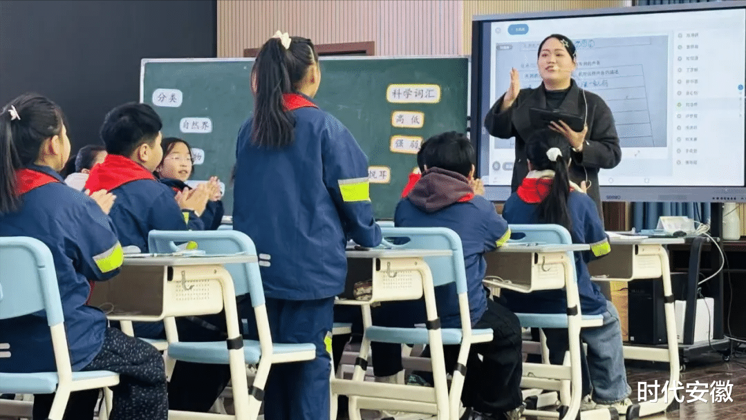 首先是来自阜阳市颍州区苗桥小学的周雅晴老师带来四年级科学《听听声音》教学展示,周老师以学生为中心,将现代教育技术与主体性教学理念深度融合,尽显先进教学智慧与扎实专业功底。课堂以“1964年中国第一颗原子弹爆炸”的音频导入,瞬间点燃学生探究热情。随后通过平板展示分类示例、播放多元声音素材,引导学生自主梳理,充分尊重学生的认知规律与自主探究权。同时,周老师巧用平板互动功能,全程以学生的体验、思考与表达为核心。课后通过平板发布生活化任务,将课堂探究延伸至日常,让学生在探究中感受科学魅力。