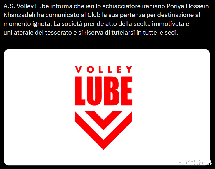 近日,意大利劲旅奇维塔诺瓦男排(Cucine Lube Civitanova)突发人事变动,伊朗年轻接应波利亚·侯赛因·汗扎德(Poriya Hossein Khanzadeh)因对上场时间不满,选择单方面终止与俱乐部的合约,提前离队,并传出即将加盟俄罗斯超级联赛球队乌拉尔·乌法(Ural Ufa)。