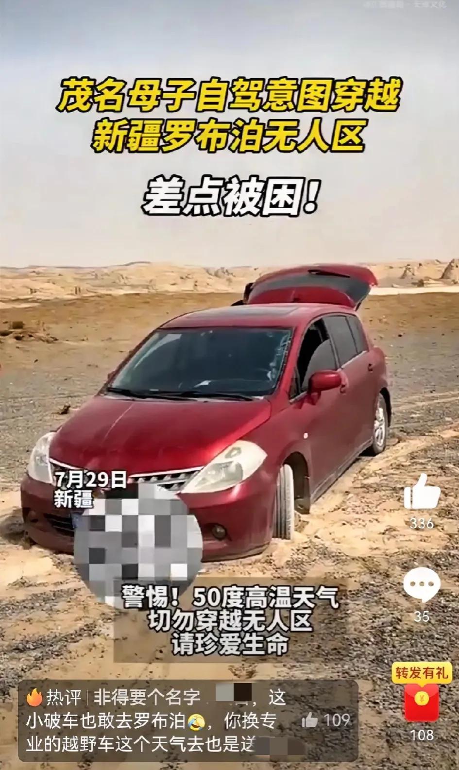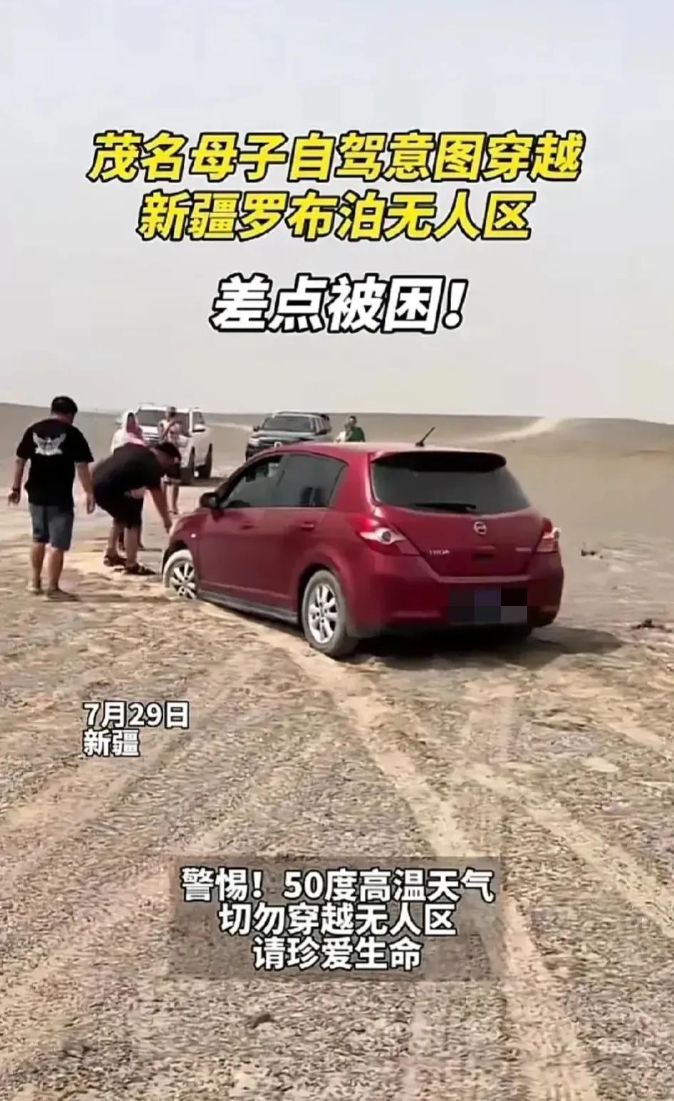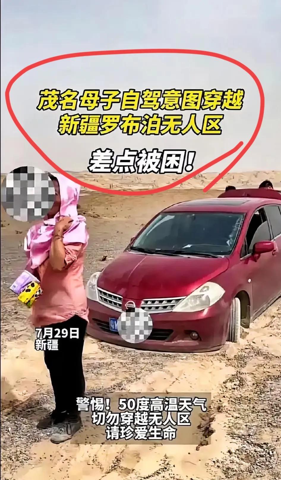 这对母子是幸运的, 无意中开到了无人区,最终获救! 据女子描述 , “就是想掉个车头,回去,没想到开到这里”。[what] 我想开着这样的小轿车是不敢去无人区的,电视都不敢这么拍! 因此猜测应该如她所说是开错了所以出门旅游还是要做好详细的攻略,尤其是临近罗布泊这种无人区,毕竟有前车之鉴啊!