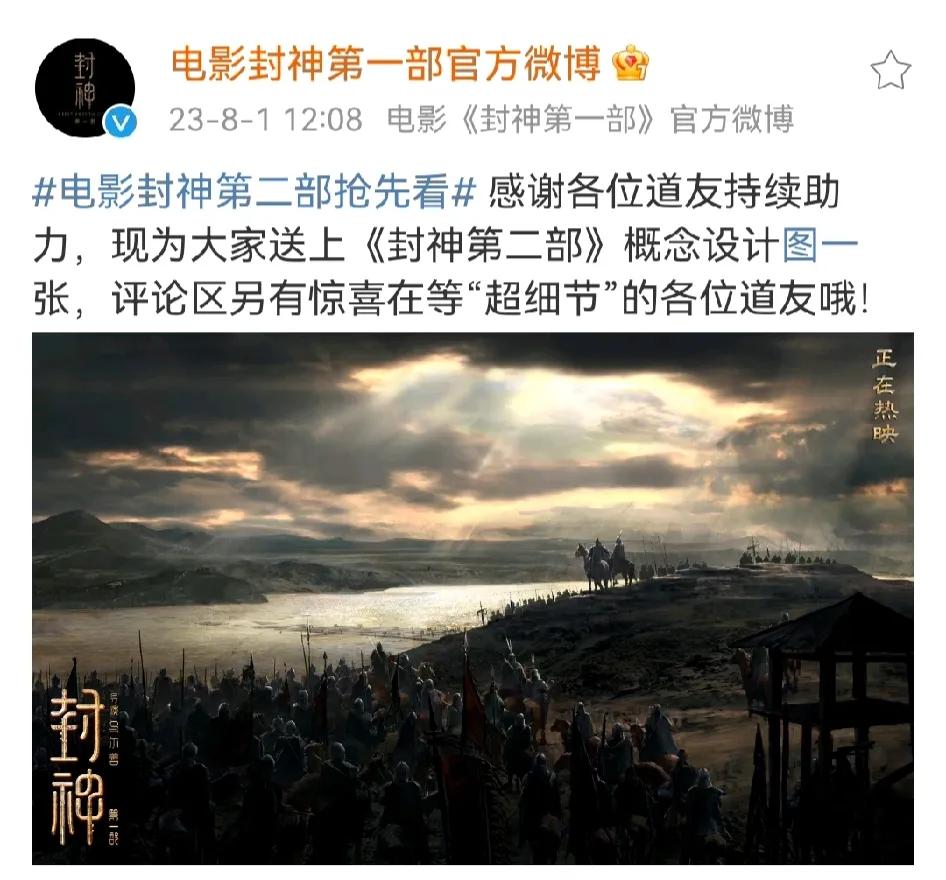 《封神》官微是会玩的, 又让网友猜谜语[呲牙] 为庆祝封神第一部破十二亿,第二部的概念图又呈现于大家面前: 网友猜测是周武王起兵灭商,在牧野决战前的宣誓。大致内容是训示从征将领和联盟部落,要知道为什么伐纣,如何列阵攻击,以及处理俘虏。 西岐保卫战?那个是黄河?然后那两个人左边那个好像是姬发(因为他有一匹白马),右边盲猜姜文唤?然后对面敌军好像差不多要来了然后这个海报颜色我的感觉天气黑暗,气氛严肃,想起来李贺的诗黑云压城城欲摧,甲光向日金鳞开,是不是要表达西岐和殷商这场战争激烈,但是西岐依然在万难中赢了?[灵光一闪] 这是黄河,是西岐保卫战,殷商大军攻过来了,过黄河!西岐军队在整军待战!![大笑][大笑]