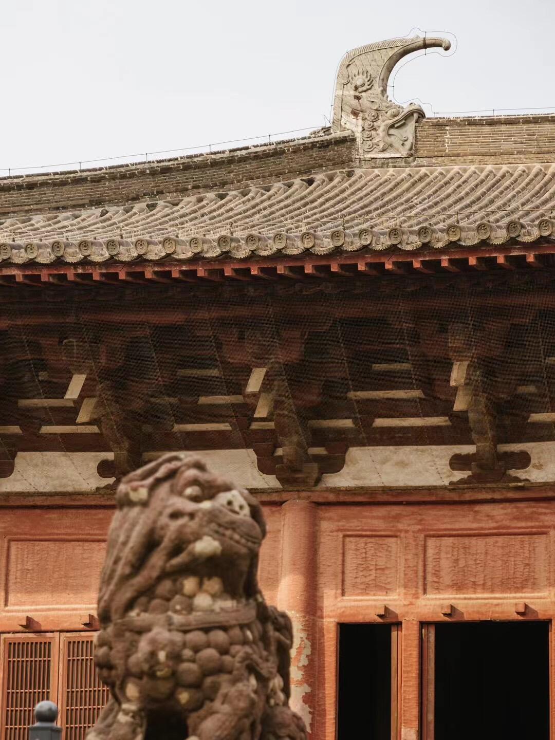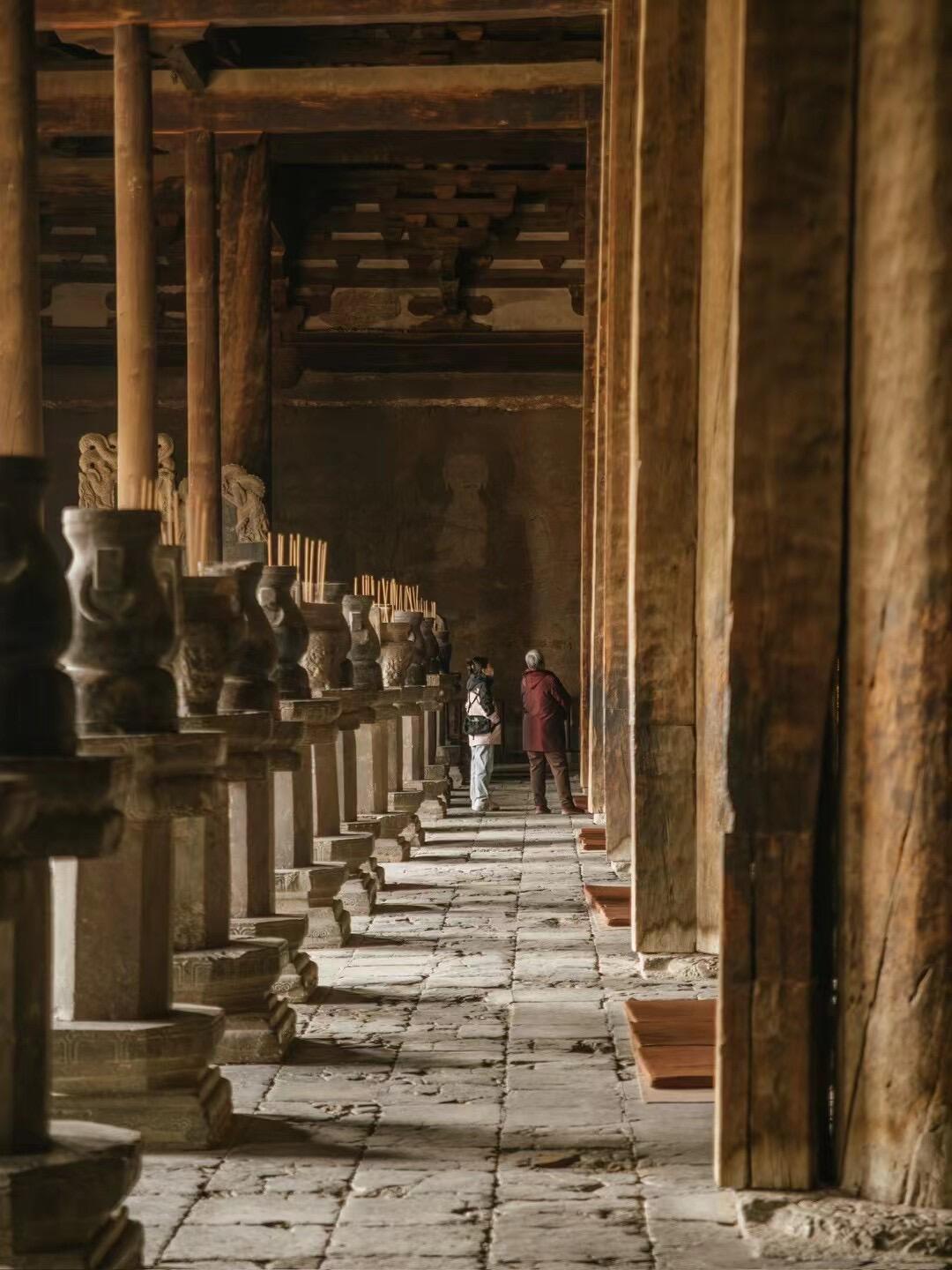 冬天的奉国寺格外冷清,大殿里几乎看不到其他游客。空旷的空间里,只有自己的脚步声在回响。这种静谧,不是死寂,而是一种历经岁月沉淀后的安详。整座大殿就像一个沉睡的巨人,静静地躺在时光的长河里,又仿佛在等待着某个重要的人,某个熟悉的故事重新上演。