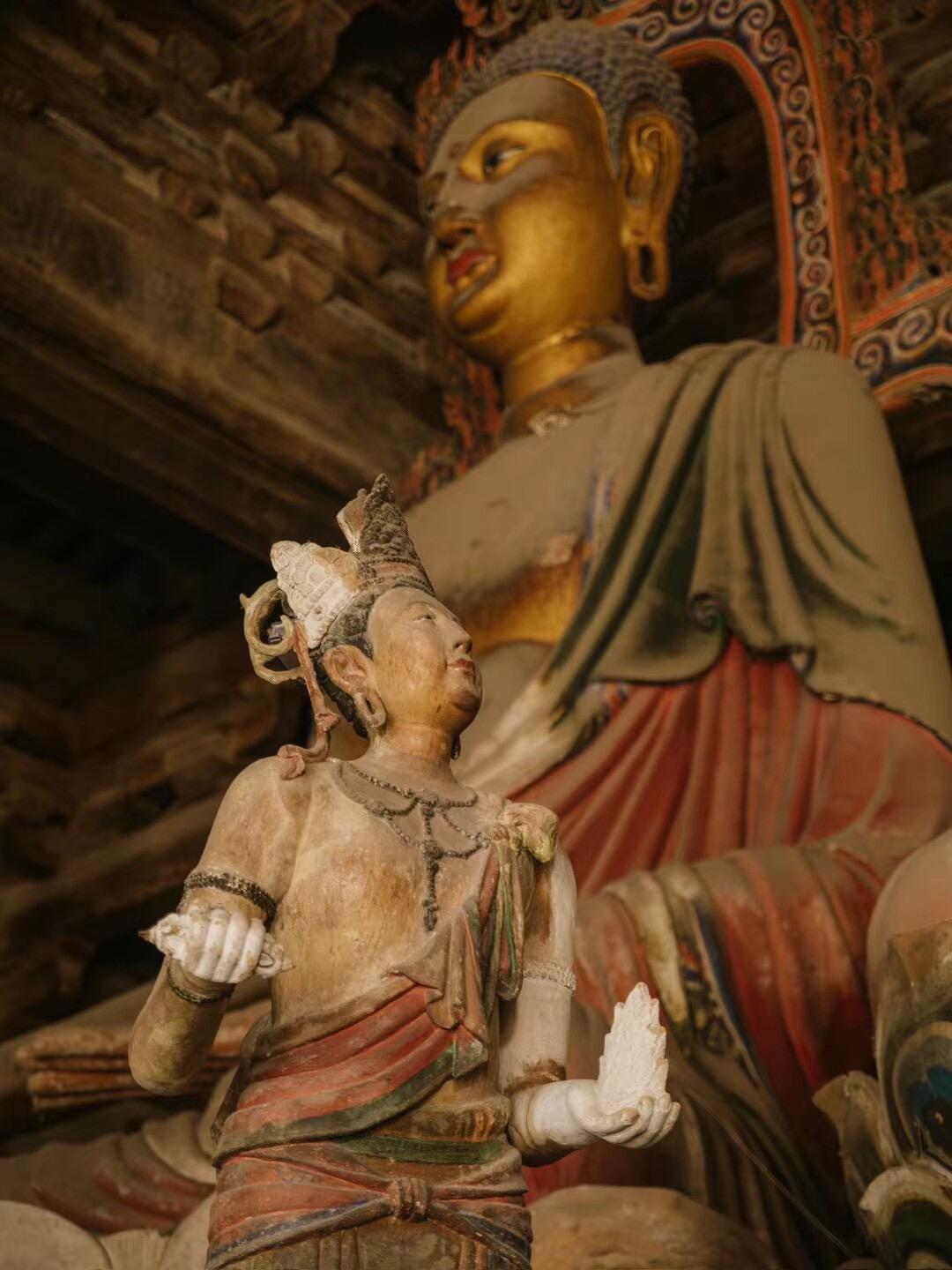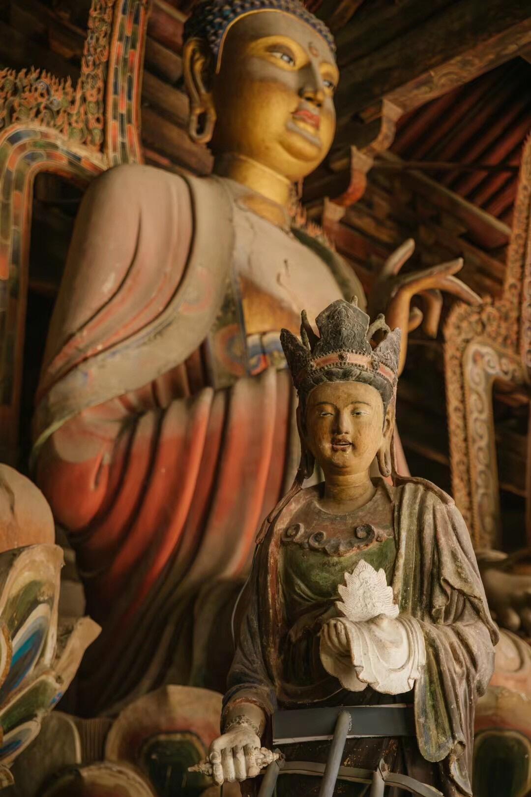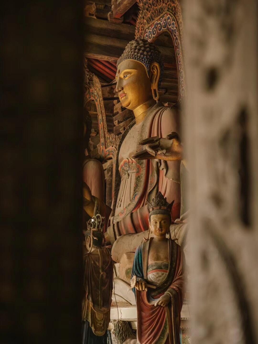 推开大雄殿那扇厚重的木门,一股陈旧的气息扑面而来。殿内光线昏暗,斜射进来的阳光里,细小的尘埃在慢悠悠地打着转。几缕阳光恰好落在佛像身上,那些未被岁月侵蚀的塑金部分,在昏暗的大殿里熠熠生辉,仿佛给佛像披上了一层神圣的光晕。七尊大佛并排而坐,身姿巍峨,面容沉静。他们在这里度过了无数个春夏秋冬,见证了朝代更迭,目睹了人间悲欢,却始终保持着那份从容与慈悲。