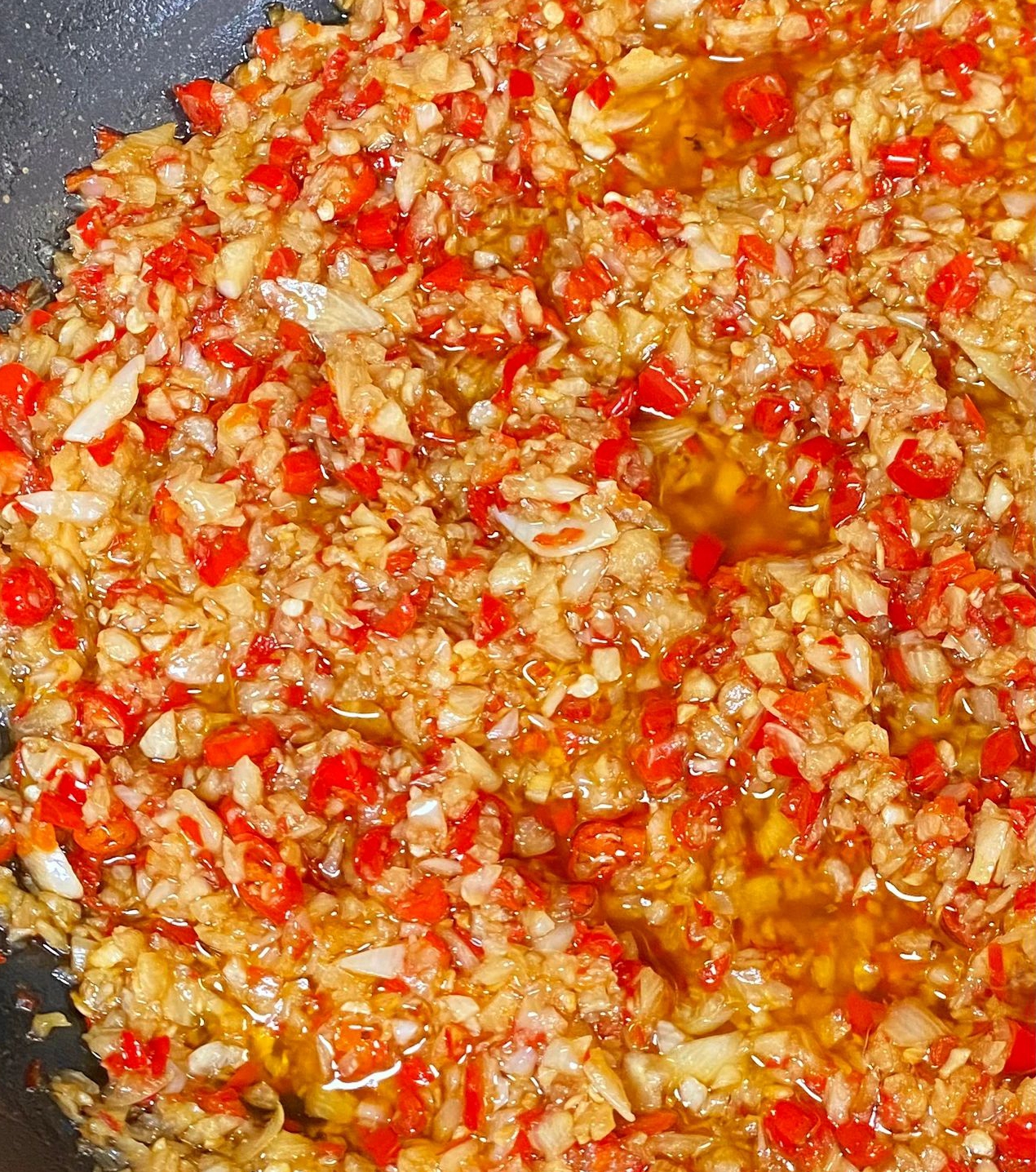 3热油下入蒜碎小火翻炒,下入小米辣 姜碎。倒入调好的酱汁,小火翻炒8~10分钟即可!