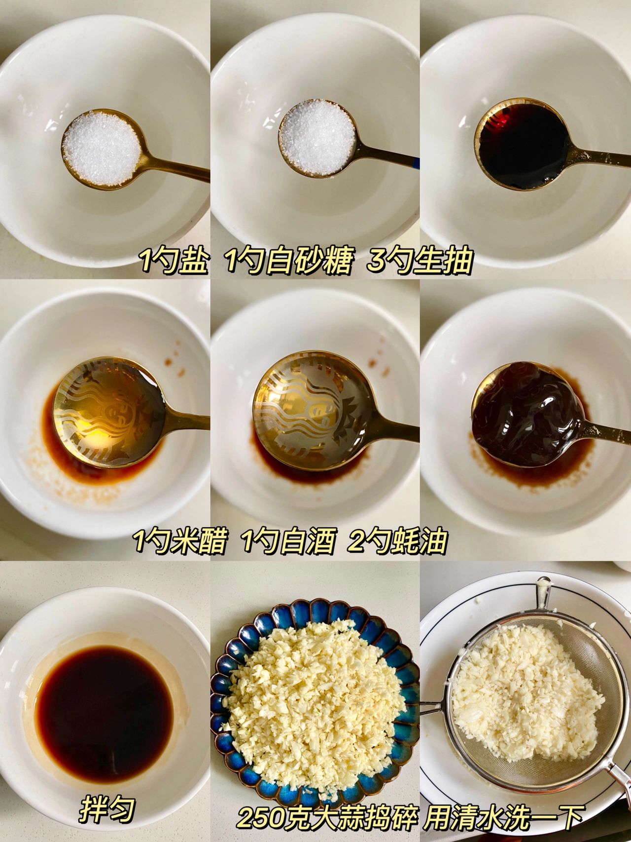 2调酱汁:盐1勺 生抽3勺 蚝油2勺 糖1勺 1勺米醋 1勺白酒(增加储存时间)拌匀。