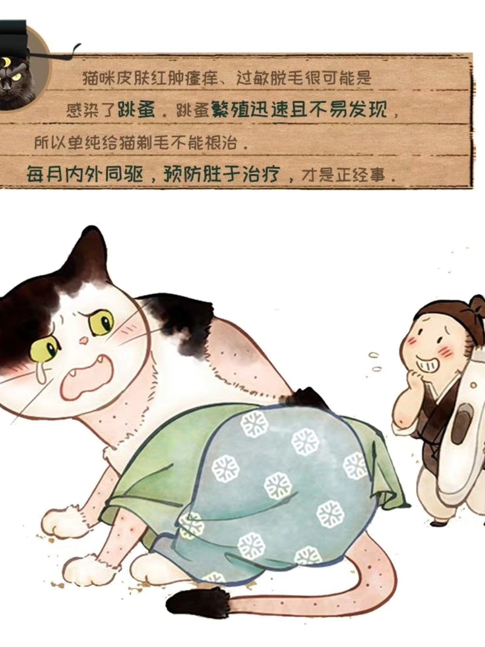 ‼️‼️宠物表现的烦躁不安,啃咬、抓挠、摩擦有皮炎的地方,一开始只是出现丘疹、红斑,若不及时处理,会出现脱毛、掉皮屑、痂皮、皮肤增厚、色素沉着等情况。感染严重的宠物甚至会出现贫血和消瘦。跳蚤最喜欢躲在屁股周围