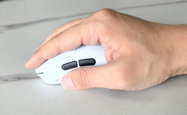 实测这款的高后背达到了42mm,并且这个高后背不是平的那种,而是有个倾斜弧度,握上去之后感觉整个手掌都是被托起来的,而非悬空状态。最让他满意的还是前方的小鱼际那块——之前用对称鼠标,以前打半小时就觉得手腕酸,因为小拇指那块没地方放。VT3s Air MAX右侧前部有个延伸设计,无名指和小拇指可以自然地前伸摆放,有了支撑点,打两三个小时下来也没什么不适感。