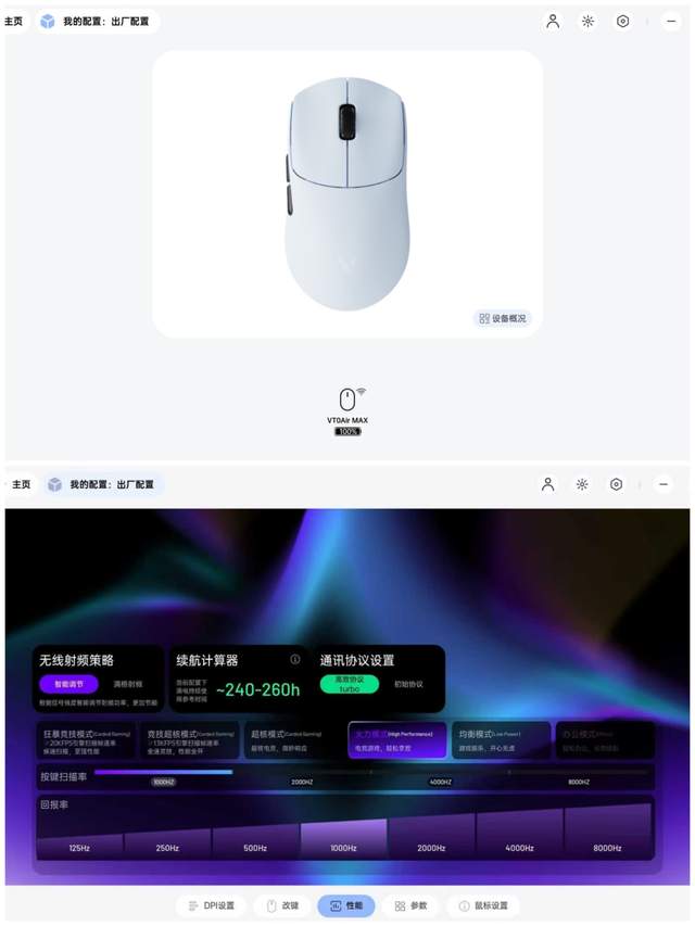 性能方面和VT0 Air MAX一样,同样用的是原相3950 Ultimate定制传感器,支持8K回报率,按键扫描率也能开到8000Hz。他说换完鼠标之后最直观的感受是“跟手”,拉枪的时候准星跟着手走,没有那种迟钝感。续航也很顶,300mAh电池1K回报率下同样能扛275小时,就算临时没电了,充电1分钟,也可以用6个小时。