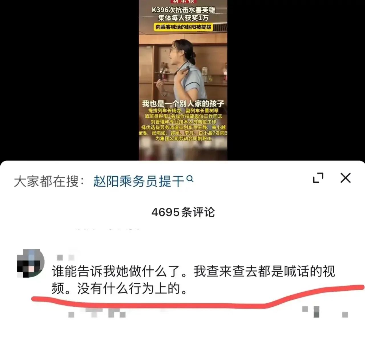“谁能告诉我她做什么了?查来查去都是喊话的视频,没有行为上的” 这么一句杠精随意的评论真的让人心寒啊! 我只记住这位列车员情真意切的话语: “我也是别人家的孩子” “穿这身儿衣服,我得对得起大家。” 要知道突发情况下,一句安抚,一句温暖人心的话对乘客们的影响有多大!就这种设身处地为乘客着想的心情,她就值得!