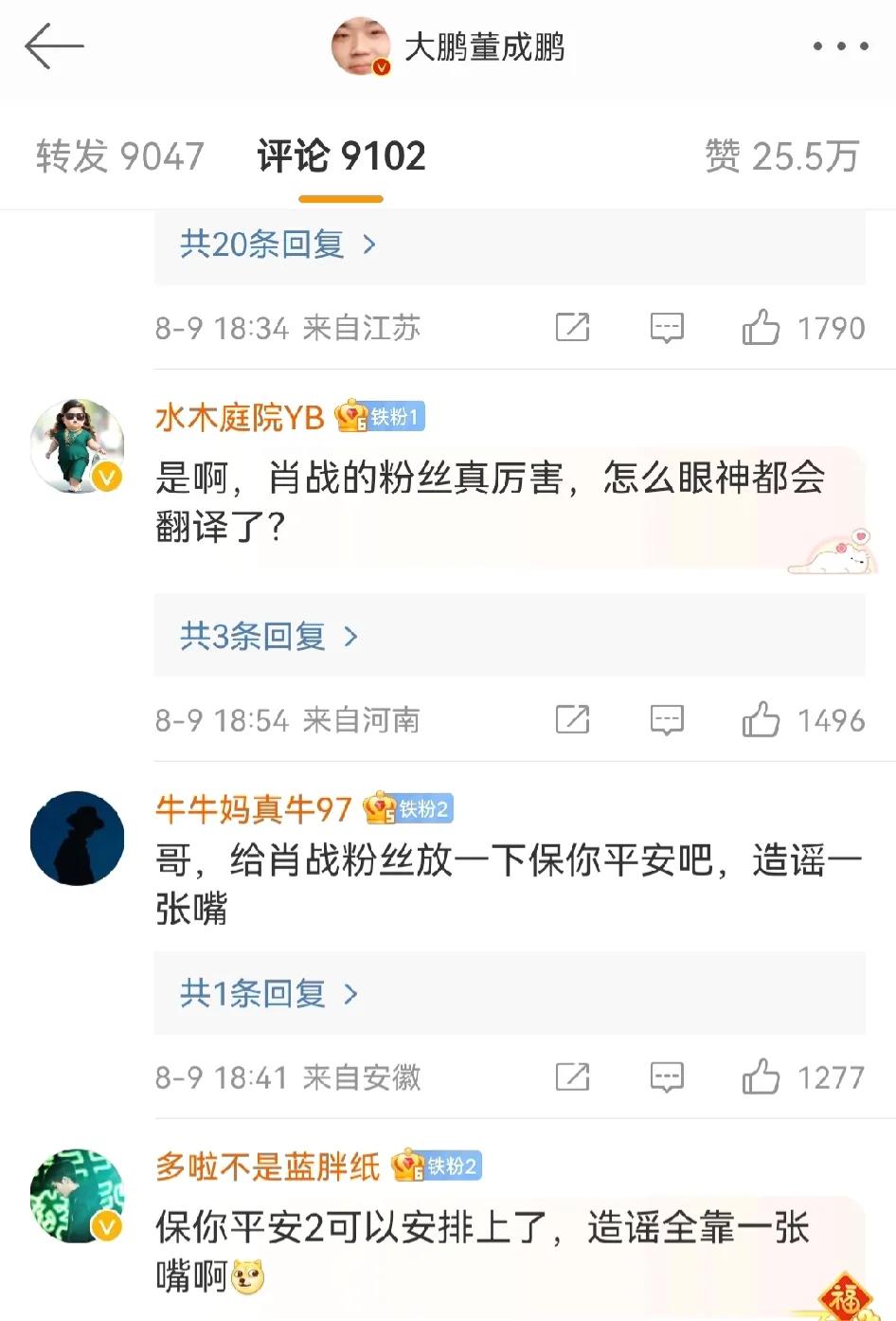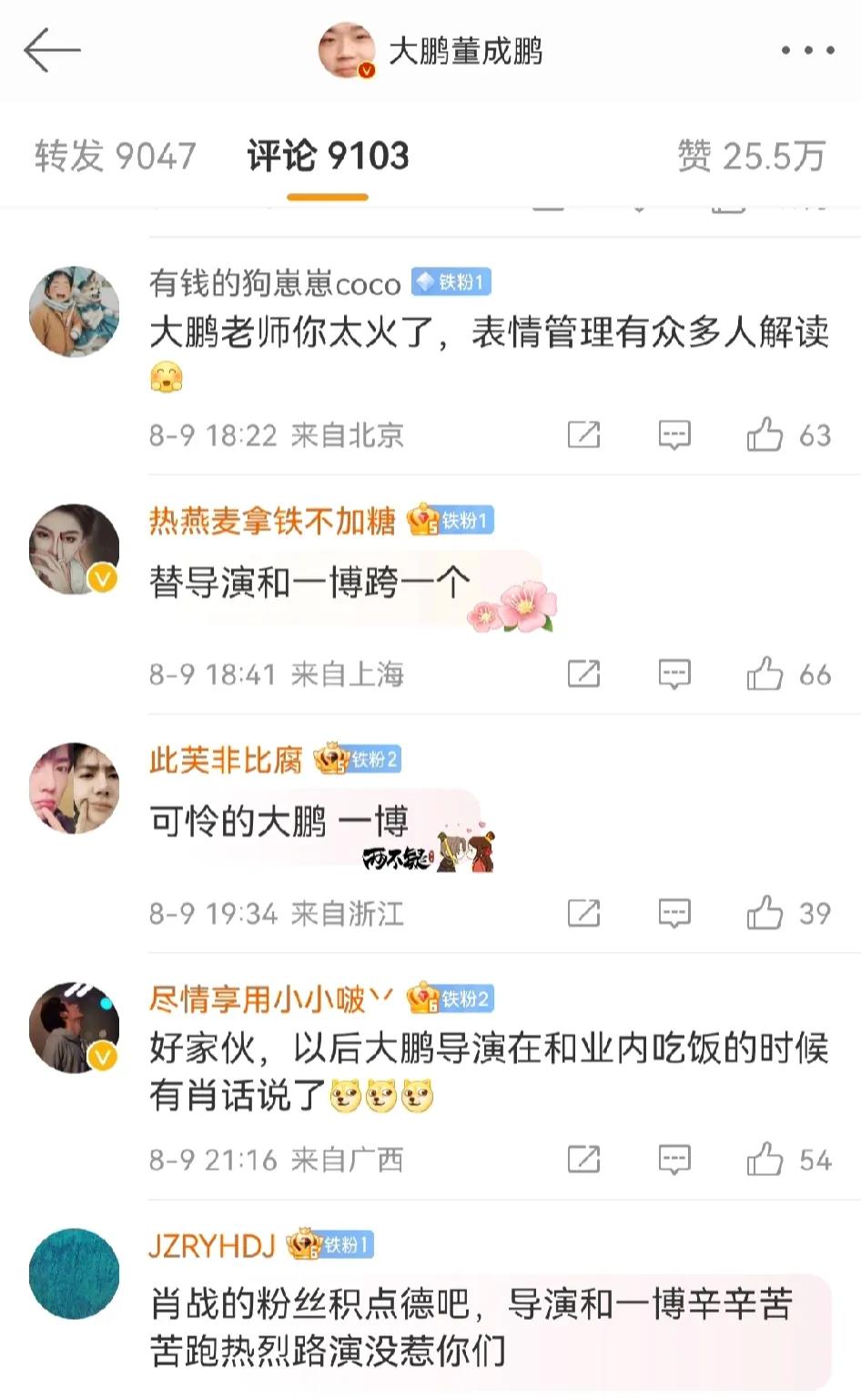 王一博,又讲错话了吗! 因为王一博那一句“之后电影怎样跟我没关系的”,大鹏现场的微表情被网友深度解读,很多人认为当时大鹏虽然心中已经翻江倒海,但是还是硬撑过去了... 有一说一啊,光看他的表情,确实看到了不少无奈。[笑哭] 然后因为网上对王一博的议论,大鹏特意发文回应并辟谣了自己的微表情,表示网友过度翻译了。 有意思的是,评论区里面都是留言这是肖战粉丝造谣。咱也看不懂了,两家又互掐了吗?