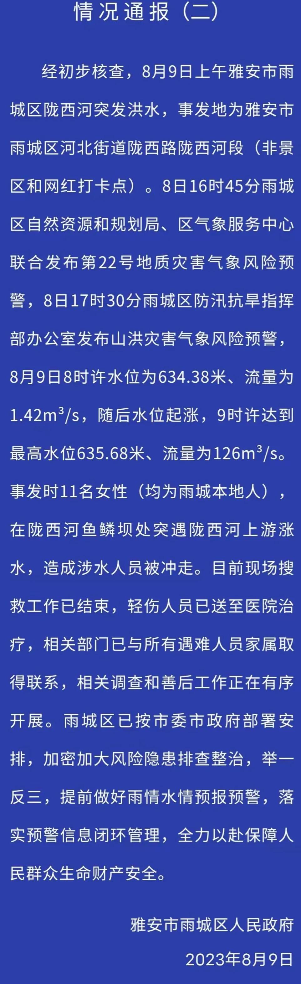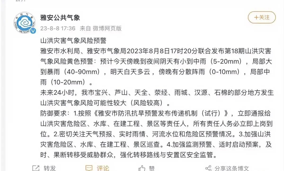 雅安当地网友讲述: 我从成都回雅安,前几天就收到山洪地质灾害的短信了,根本不敢去河沟这些地方。 可是11个本地退休阿姨还是一起开心地出去游玩,谁想遇到突然来水被冲走,结果7人遇难。 其实鱼鳞坝不是不能玩,毕竟建造它就是为了吸引人来趟水的,但是不能在气象部门明确发了山洪灾害气象风险黄色预警之后还下水,太可惜了。