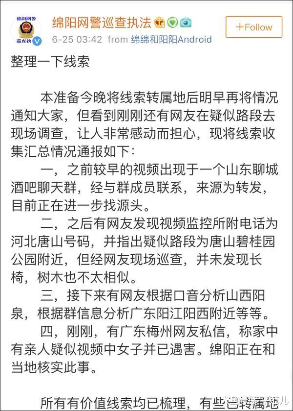 6月25日凌晨,根据网友提供的线索,@绵阳网警巡查执法 在微博发帖寻求河北唐山网友的帮助。