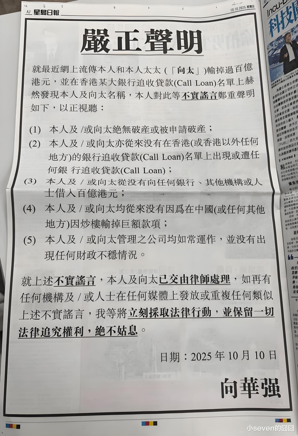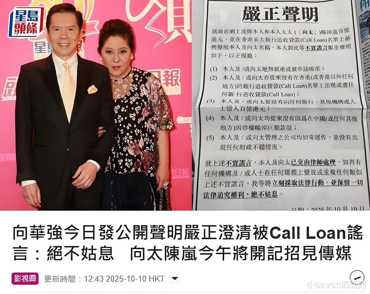 而在上个月网络上更是传出了“向家破产”的消息,根据网络上的传闻,香港某家顶级大银行“Call Loan名单”上就有向华强夫妇。