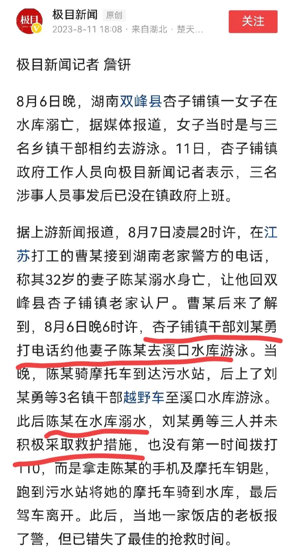 这事你能想明白? 三个镇干部为什么约一个少妇去游泳 ? 而且还是水库。 三男一女为什么在天色马上要黑了去游泳? 只听说过夜钓,没听说过夜泳。 女子溺水,三个大男人还救不了一个弱女子吗? 出师后为何还要逃逸? 中间有何隐情? 这些疑问我想只有等官方正式通报了才能搞明白,静待后续。