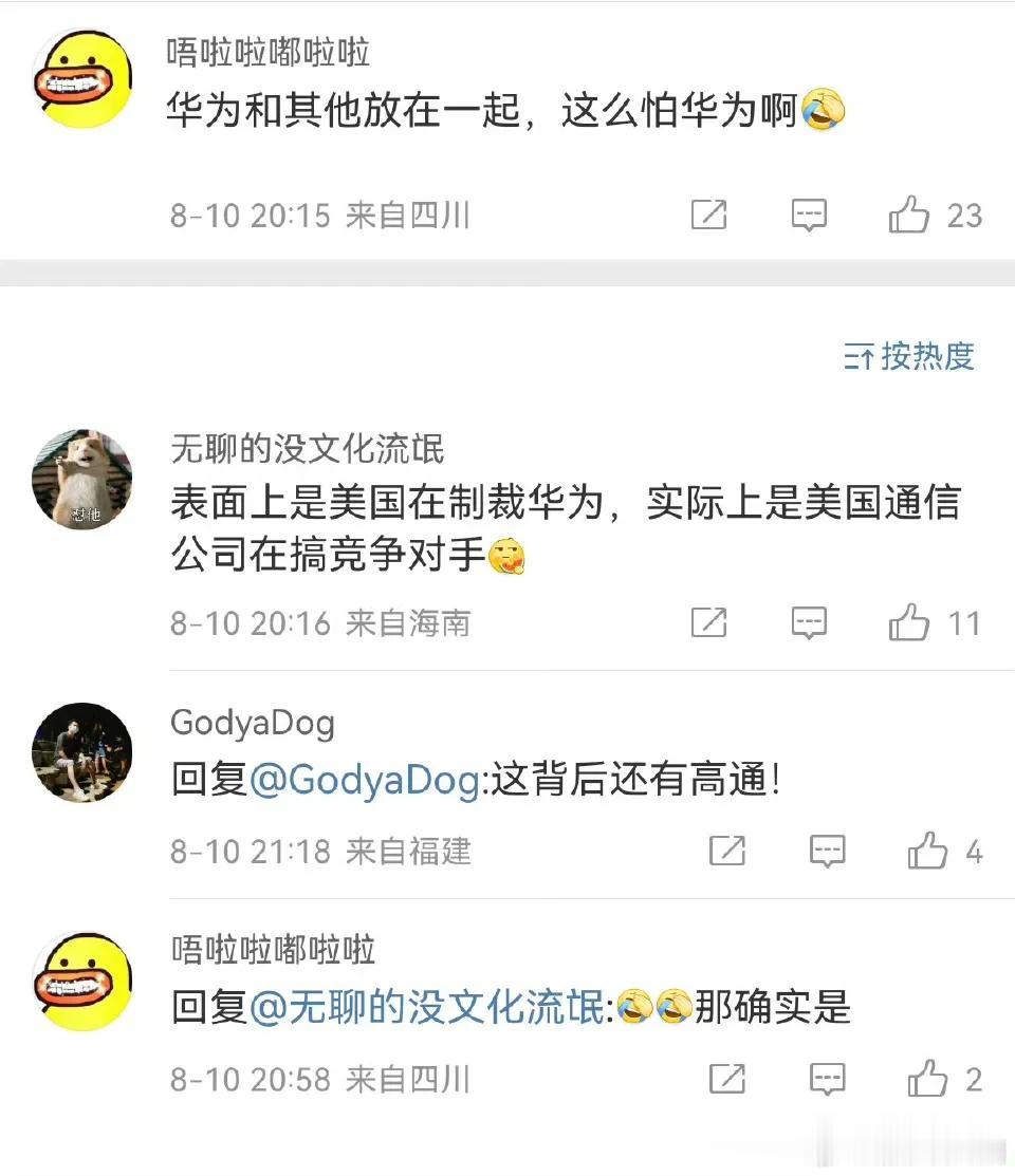 人生的厨房 42 2023-08-12 19:31 华为会打开本来是它们独占的市场,去挣钱;华为能打破它们的成闭环的情报、监控全球的体系;华为不带国别倾向的基础设施建设,有利于拥有国政治独立、经济发展,以及所在地人民享受到信息技术的便利及实惠,利于民族交流、数字化社会建设…… 无禁言 回复 08-13 12:03 华为卖给伊朗美国技术的产品 轻松 回复 无禁言 08-13 20:30 不是科技无国界吗?