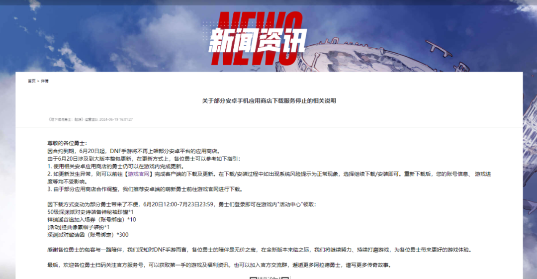 《地下城与勇士:起源》运营团队发布公告称,因合约到期,DNF手游将不再上架部分安卓平台应用商店。意味着相关渠道的玩家需通过官网下载最新版本,而不能通过应用商店更新游戏。