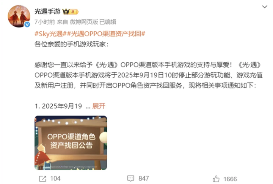 2025年8月,《梦幻西游》《率土之滨》等王牌产品宣布退出;9月,《光·遇》《明日之后》《大话西游》等热门手游跟进停服;10月,《逆水寒》《实况足球》等也加入停服阵营。至此,网易手游几乎全面撤离OPPO渠道。