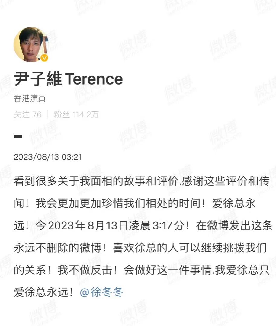 尹子维, 很难让女人拒绝! 他最近被网友称为微博第一深情,香港第一深情。 这么直白深情的示爱真的挺让人感动,有人说这些表白谁都会写。但是我却从他的字里行间感受到他真的爱徐冬冬。他的微博真的又真诚又好笑, 大湾区第一深情靓仔,祝福。