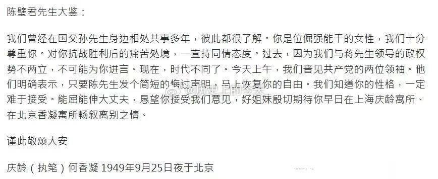 #文史资料#宋庆龄给汪精卫夫人的一封信:陈璧君先生大鉴:我们曾经在国父孙先生身边相处共事多年,彼此都很了解。你是位倔强能干的女性,我们十分尊重你。对你抗战胜利后的痛苦处境,一直持同情态度。过去,因为我们与蒋先生领导的政权势不两立,不可能为你进言。现在,时代不同了。今天上午,我们晋见共产党的两位领袖。他们明确表示,只要陈先生发个简短的悔过声明,马上恢复你的自由。我们知道你的性格,一定难于接受。能屈能伸大丈夫,恳望你接受我们意见,好姐妹殷切期待你早日在上海庆龄寓所、在北京香凝寓所畅叙离别之情。文史公原创版权,请勿转载,违者必究。