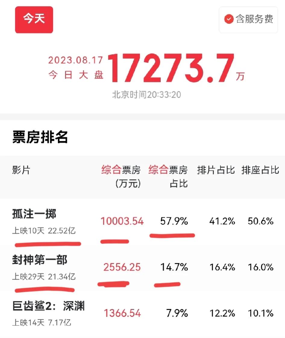 电影《封神》磕磕绊绊冲向22亿,《孤注一掷》却笑了! 因为它后来居上,轻轻松松就领跑第一。看今天的数据,排片,当日票房,总票房,封神全部被碾压,这就值得《封神》反思了。 作为神话巨制,封神大投入,大制作,口碑反转,拥趸无数,怎么就仅仅10天被反超,问题出在哪? 真心希望他票房好一点,能尽快出第二部和第三部!