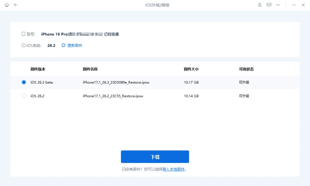 步骤3:选择需要升级的固件版本后,点击【下载】等待开始下载iOS固件