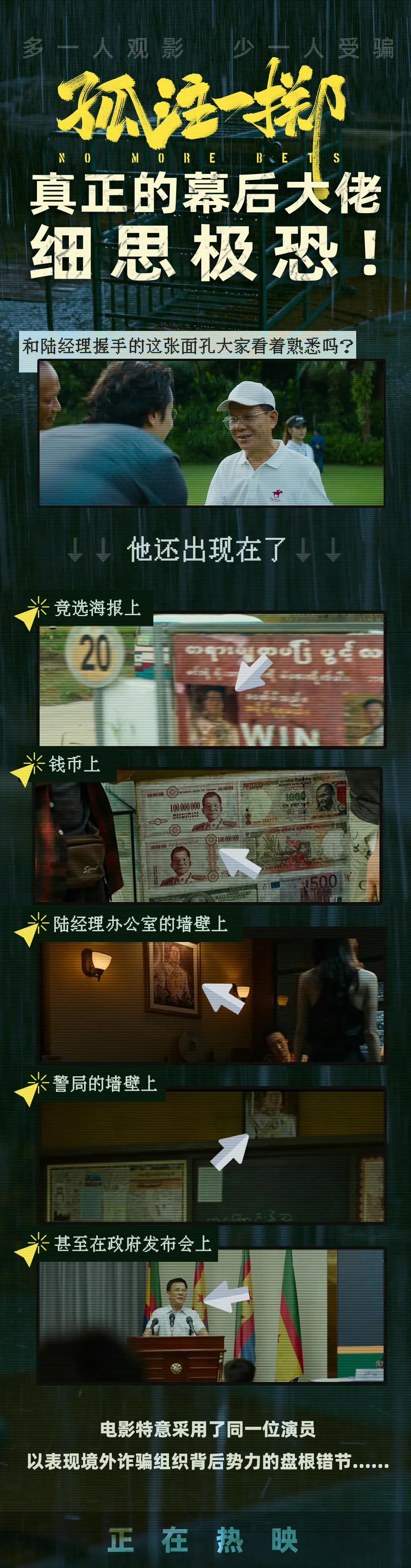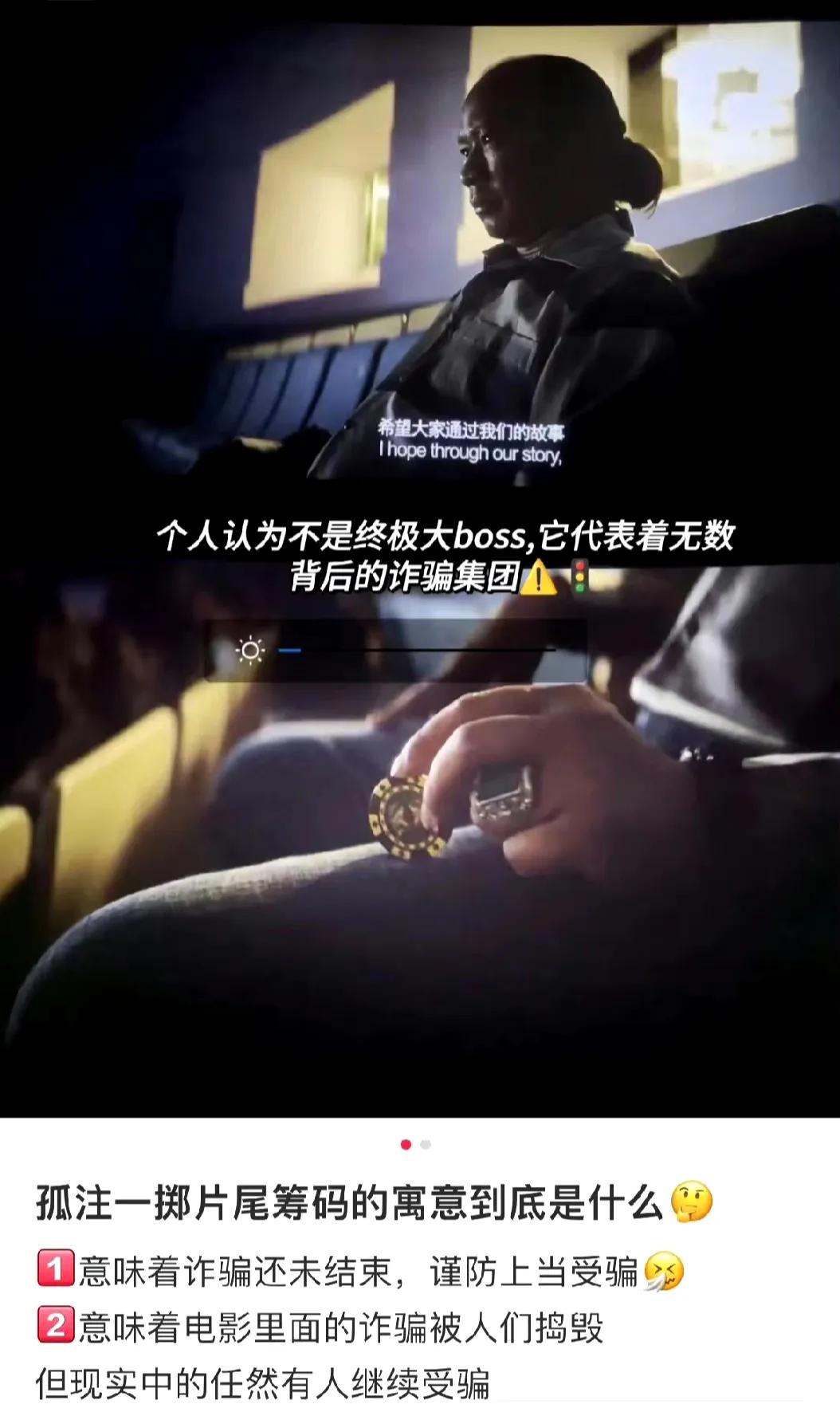 《孤注一掷》官微终于公布了真正的幕后大佬,我们还是小看了这部电影! 很多人和我一样,认为电影最后在反诈中心最后一排,那个戴大金戒指手里拿着筹码才是大boss,其实格局小了,他最多就是王传君这样的角色,大老板怎么会以身犯险,怎么会让人看出来他是坏人。 其实那个大BOSS在整部片子中一直反复在出现,贯穿整部电影,甚至出现在了钱币上,隐藏地太深了,这就是为什么被骗过去了就那么难救回来的真正原因!
