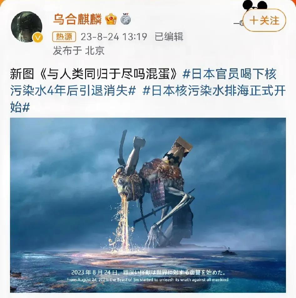乌合麒麟最新作品: 被核污水污染的海面上,一个佝偻的变异怪物跪着谢罪!脖子,爪子被漆黑的锁链锁住,头和背部扎了两颗原子弹,一把武士刀代表向全世界谢罪!!!