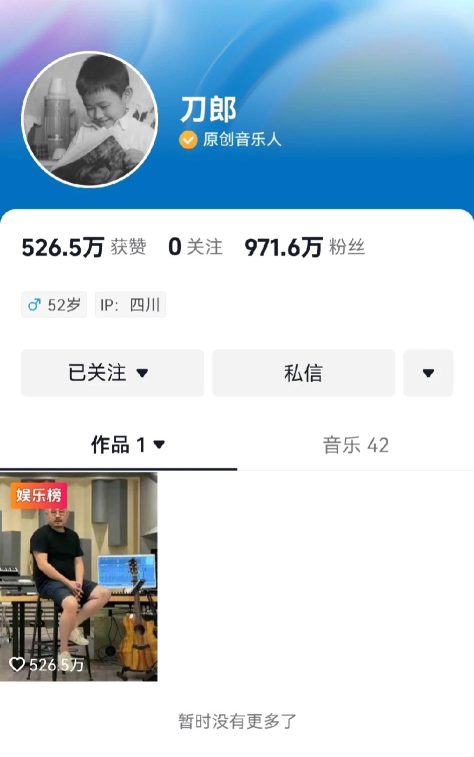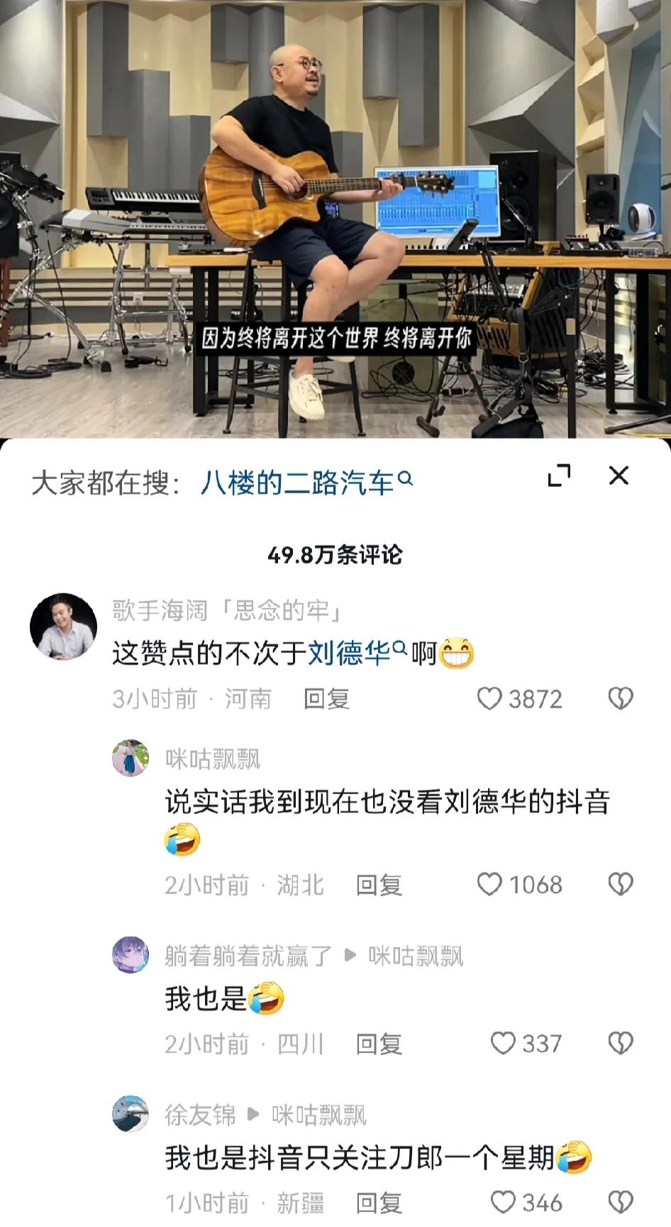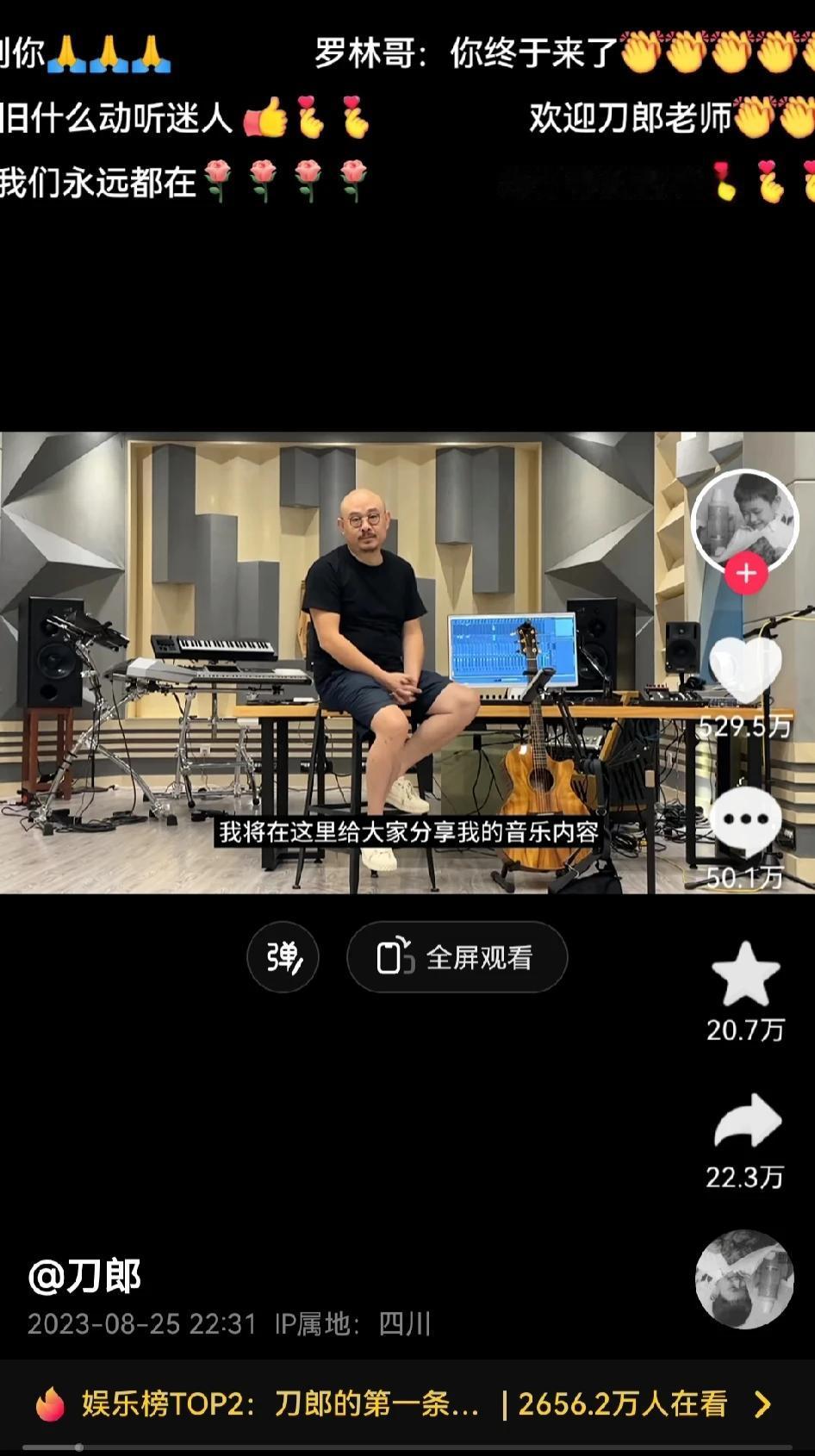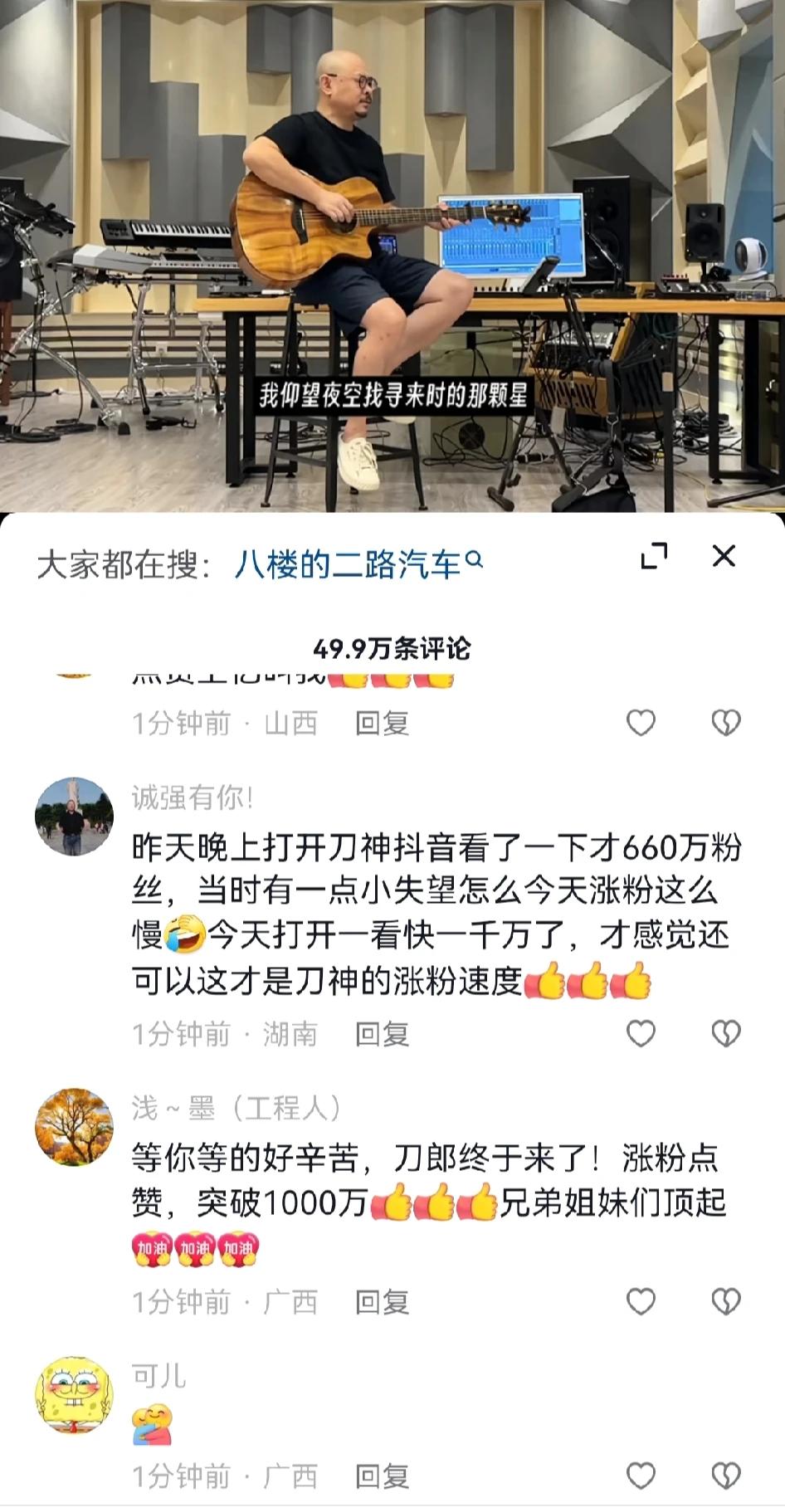 刀郎抖音第一条, 输给了那英,差点赢了刘德华[笑哭] 好声音停播的当天晚上,刀郎的第一条抖音姗姗来迟。 目前刀郎的粉丝马上破千万,第一条视频的点赞数已超五百万,点赞数跟天王刘德华常规的视频差不多。 但为什么说输给了那英呢?那英虽然粉丝才200万,但是那条视频的评论早就过1000万,向着2000万挺进,这好像是无人可及的高度[尬笑]