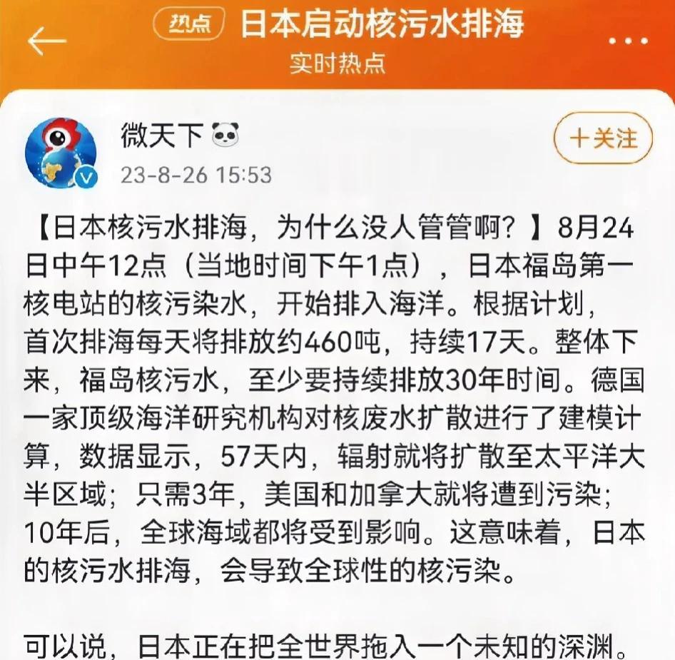 上海陶老师 2023-08-27 23:00 今天是日本继续核污染水排海第四天!!!!!!!!!!!!!!!!!!!! 抵制日货,是表达义愤填膺最实际的行为,为守护自己及家人的健康计,请自觉拒买日货证明自己的自尊自爱自怜!!!这是做为老百姓唯一可以为国家做的事了!请国家硬气点,像嘴上说的那样,守护好国人的健康,继续极限施压日本,阻止核污染水每天继续排海!同胞们!拒绝躺平,行动起来!!!否则我对后世之人无法交代我们的所做所为!!!