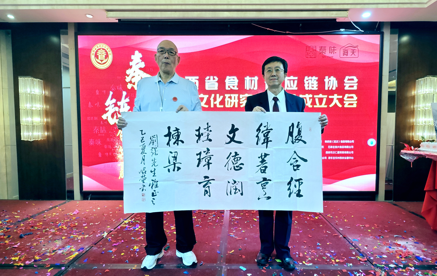 美食研究者姚永利赠送书法并说:书法内容解析“腹含经纬著烹文,德润珪璋育栋梁”。这两句对仗工整,“烹文”紧扣饮食主题,“珪璋”提升文化格调,既精准概括了刘教授的学识、著作价值与行业贡献,既显对饮食文化的尊重,也饱含对刘教授的敬意。