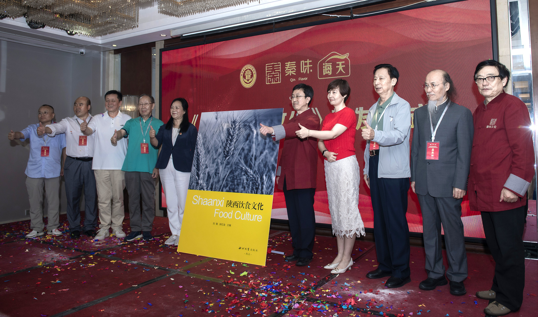 《陕西饮食文化》编委会,由主审王新丽、朱选朝,主编刘强、吴红金,副主编田建国、齐和、黄涛、杨涛、王辉,参编刘书源、杨文利、张金平、丁永军、耿毓、李彤等组成;由国家一级设计师石卓立先生装帧设计,英文翻译刘强,西北大学出版社出版。