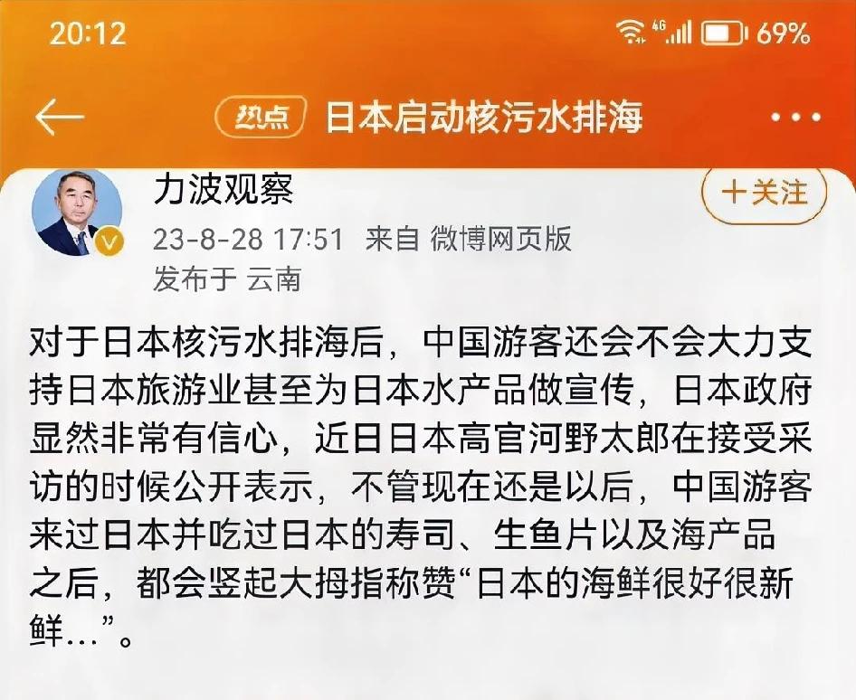 他,河野太郎, 在核污水排海后发言: 中国游客还会大力支持日本旅游业,甚至为日本水产品做宣传。 他认为,不管现在还是以后,中国游客来过日本并吃过日本的生鱼片,寿司,海产品之后,都会称赞“日本的海鲜很好很新鲜”。 不知道这个太郎哪里来的信心 ? 首先中国游客还会去日本吗?其次,去了之后会吃海鲜吗?再怎么样,我想以后也很少有人会跑去日本吃海鲜,吃日料。 只能说理想很丰满,现实很骨感!