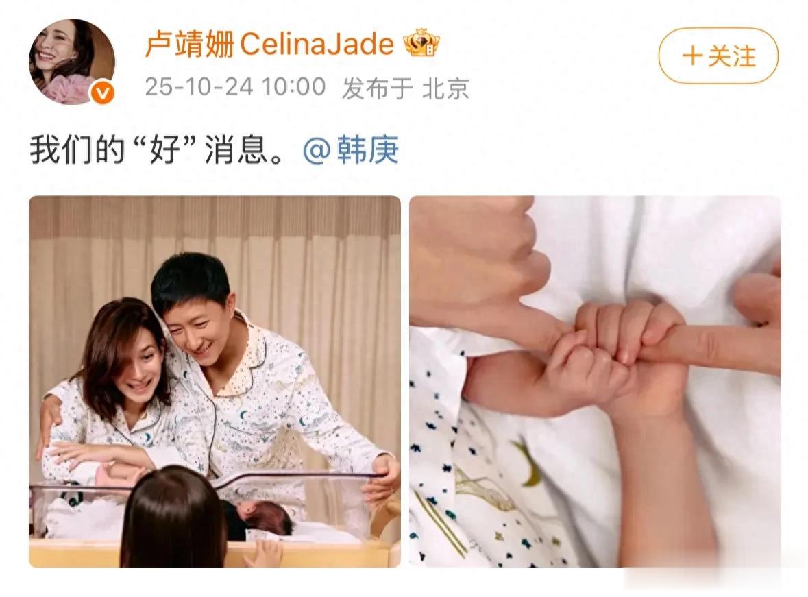10月24日,韩庚和妻子卢靖姗官宣自己的二胎生出生,也用了“好消息”来告诉大家,儿女双全,二胎生了个儿子。