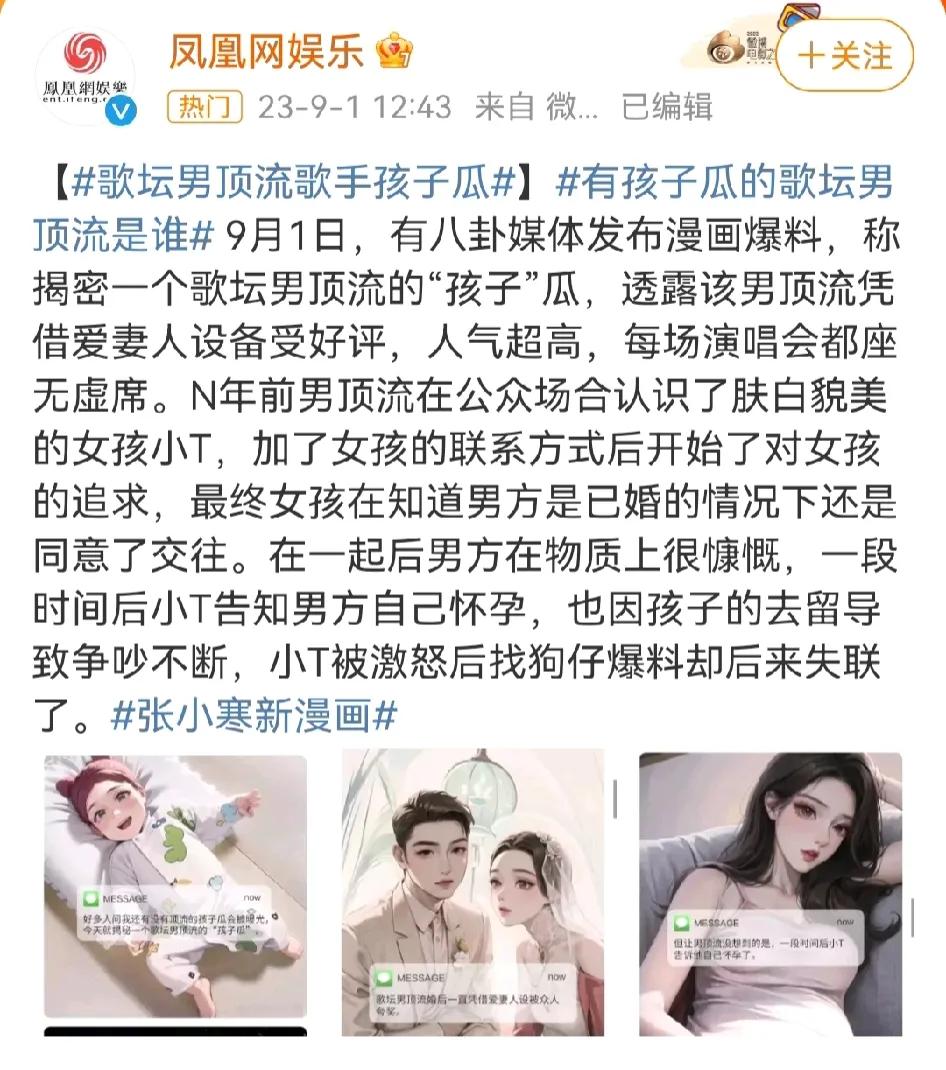 这才是今天娱乐圈最大的瓜🍉🍉🍉 歌坛男顶流,已婚,出轨, 已经有了孩子并已经出生,女方失联... 根据网友推测,从爱妻人设来看,名字范围已经缩小到一两个人了,名字里含有J。 网上各种猜测都有,zjl,zj躺枪,反正真的假不了,假的真不了,但是杰伦我是不信的,他不是男顶流,是天王。 那么最后会是谁呢?难道又要塌一位?具体等狗仔后续爆料吧!