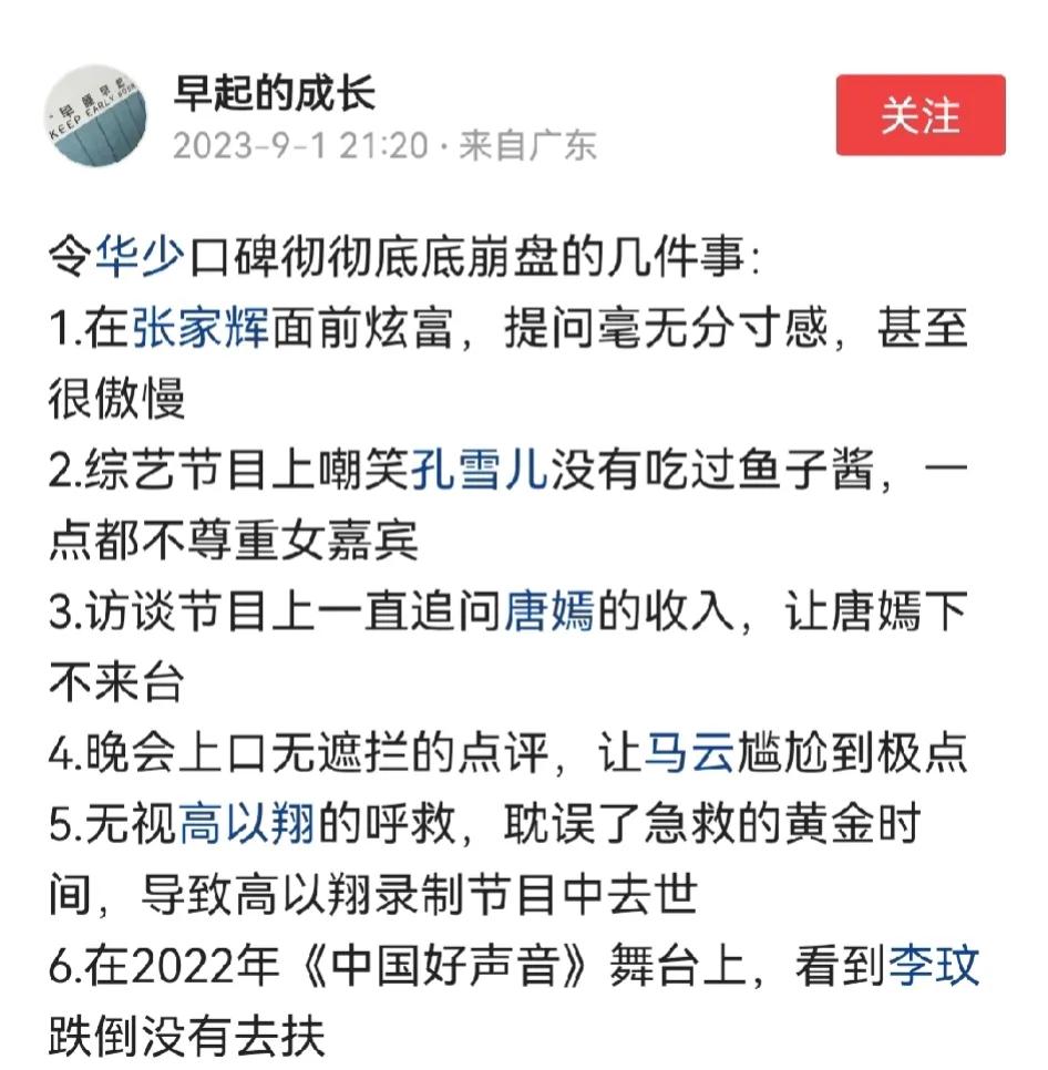 蓝台一哥华少,现在路人缘怎么崩成这样了? 当年华少最红,如日中天的时候,你可以真正地相信华少!口才真的是一门艺术,那时候这辈子最大的梦想就是拥有华少的口才和嘴皮子,有他在的晚会会让人很有安全感,不愧是业务能力扛把子。 可惜不知什么时候起,他的口碑渐渐变差了,但是不管如何也不能塌房,那些恶意造谣的可以消停了。