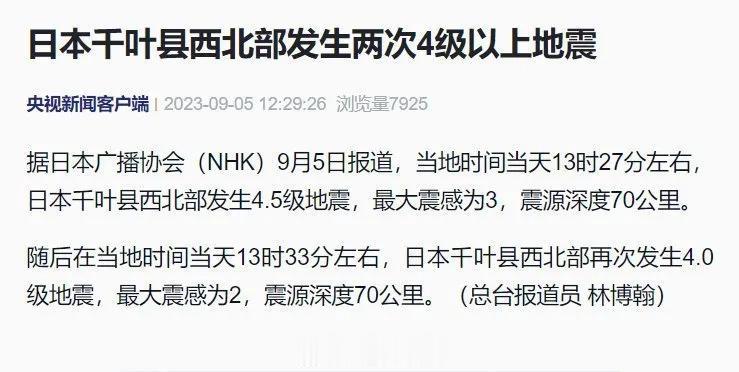日本又地震了, 6分钟,连续两次,一次4.0,一次4.5。 有人说,日本民众是无