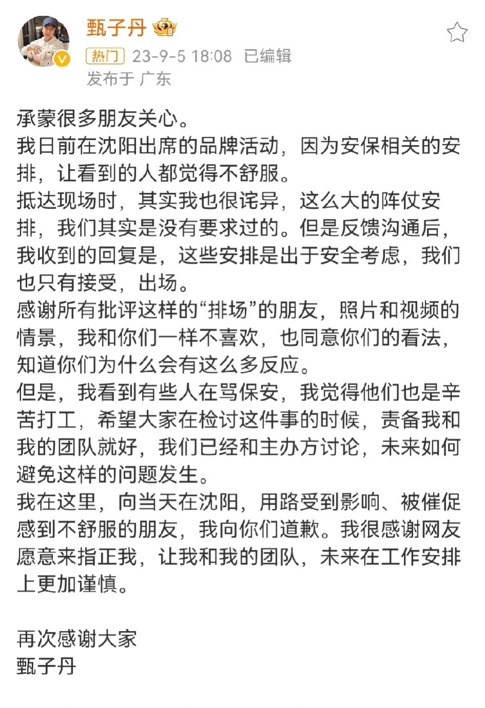 甄子丹,扛不住道歉了! 近日,甄子丹在沈阳出席活动,现场的安保密密麻麻,网友说他排场大,功夫巨星还需要这么多人保护。 对于这些声音,今天甄子丹发微博作出回应,他表示自己也不喜欢这样大的排场。 要怪就责怪他和他的团队,而不是责怪打工人,他们挺不容易的。不得不说,甄子丹的回应格局真大。 网友表示: 第一次看到有明星回复这种事情,谦卑,得体,大方,周到,真正的巨星。 大师级的回应!当事人旁观者都有被安抚到。